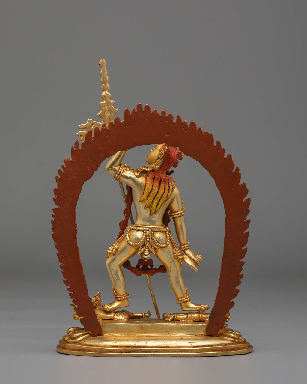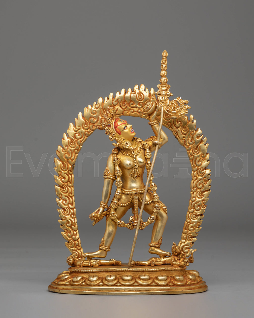 The intricate details of this handcrafted statue reflect traditional Tibetan artistry, capturing the essence of Vajrayogini’s dynamic energy. Her multiple arms and graceful posture symbolize her ability to guide and protect devotees. The gold plating adds a radiant glow, representing purity and spiritual illumination, while the acrylic colors bring life and vibrancy to her form. Ideal for meditation spaces, altars, or as a centerpiece in your home, this statue invites peace, wisdom, and spiritual growth into your environment.