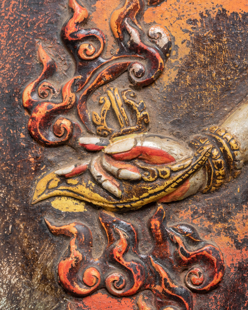 This Vajrayogini Wooden Frame Wall Hanging represents transformation, insight, and ardent compassion in Tibetan Buddhism. This magnificent work, 68.5cm high and 53cm wide, is skillfully created with clay on a robust wooden base, bringing Vajrayogini's bright vitality to life. The hand-painted acrylic hues and exquisite detailing make it an appealing focal point for meditation rooms, temples, and spiritual houses.