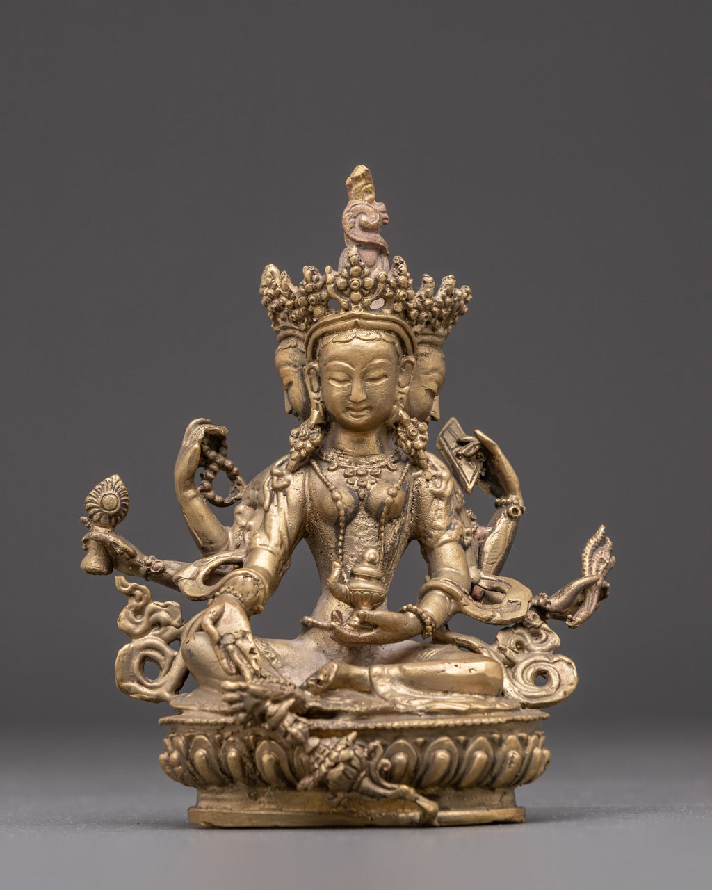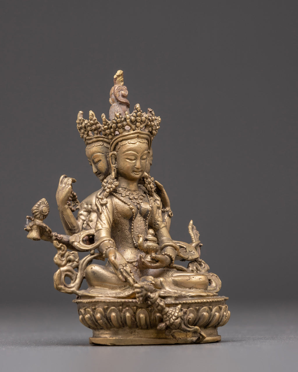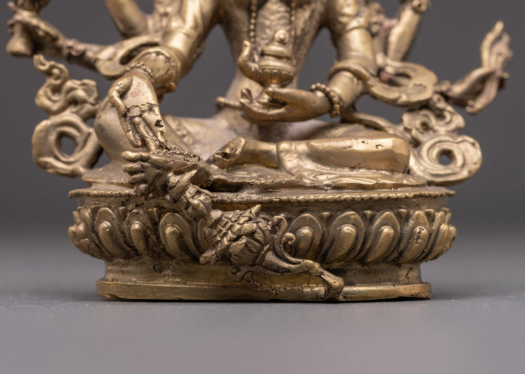 The Vasudhara Goddess of Wealth Statue embodies the essence of prosperity, generosity, and balance. Handcrafted from brass, this 16cm tall and 13.5cm wide sculpture radiates the serene presence of Vasudhara—the revered Buddhist goddess of wealth and abundance. Known as the consort of Jambhala, she symbolizes not only material prosperity but also spiritual richness, guiding devotees toward a life filled with compassion and wisdom.
