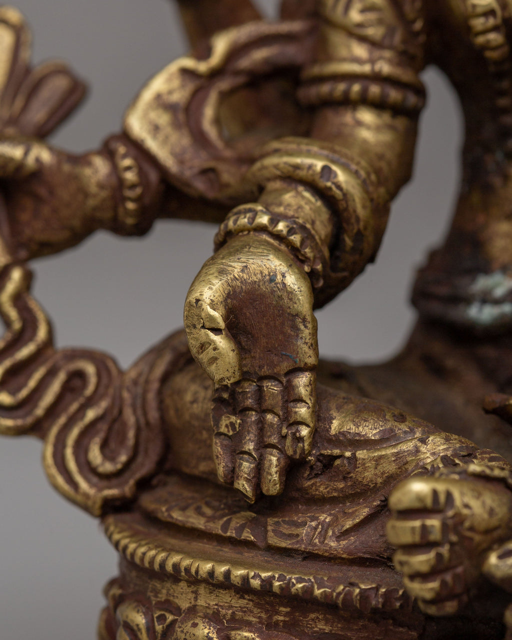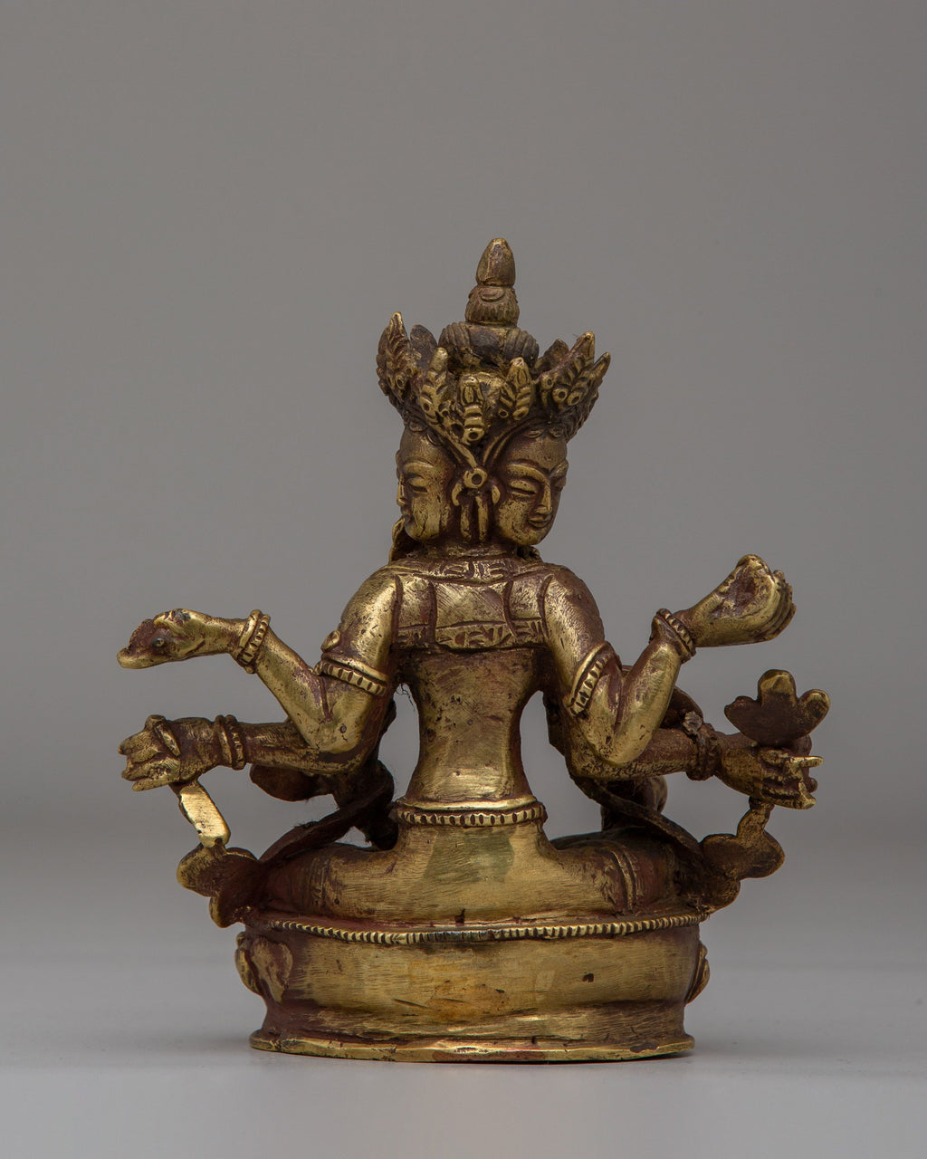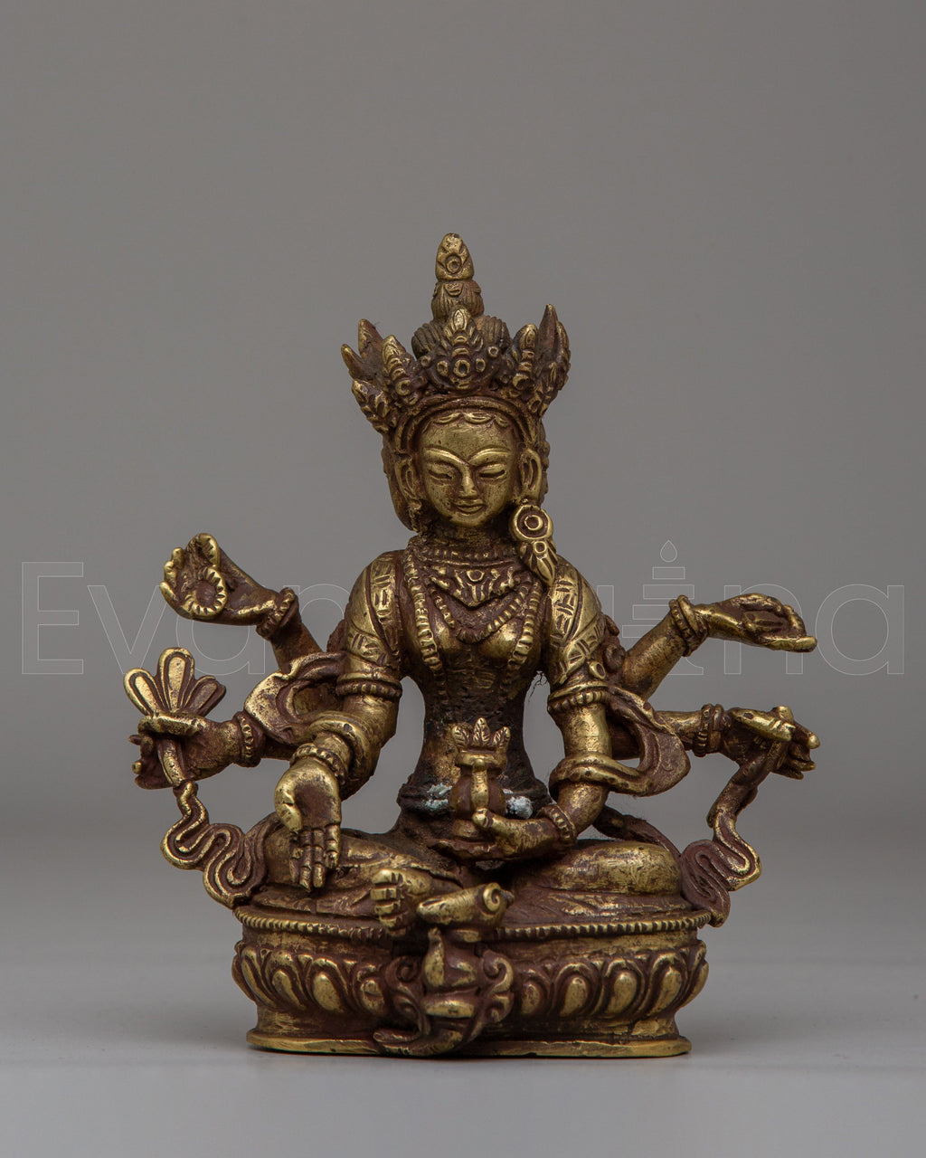 The Tibetan Vasundhara Deity Statue is a sacred representation of Vasundhara, the Hindu goddess of prosperity, abundance, and earthly wealth, revered in both Tibetan and Himalayan traditions. Measuring 14.5 cm in height and 13 cm in width, and weighing 0.75 kg, this beautifully crafted statue is made from brass, reflecting the rich heritage and spiritual artistry of the region. Vasundhara is believed to bless her devotees with material wealth, fertility, and spiritual growth, making this statue an ideal addition to altars, meditation spaces, or homes seeking abundance and good fortune.