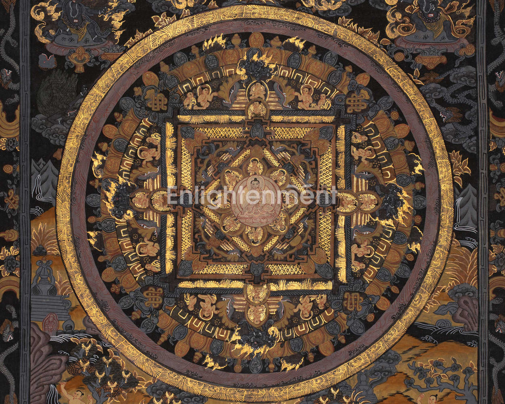 Surrounding the Buddha are intricate patterns and symbolic motifs that further enhance the Mandala's spiritual resonance, inviting contemplation and inner reflection. As a representation of Buddha's teachings and spiritual guidance, this vintage-inspired masterpiece serves as a profound spiritual symbol, reminding us of the eternal truths in Buddha's teachings and connecting us with our inner light and wisdom.