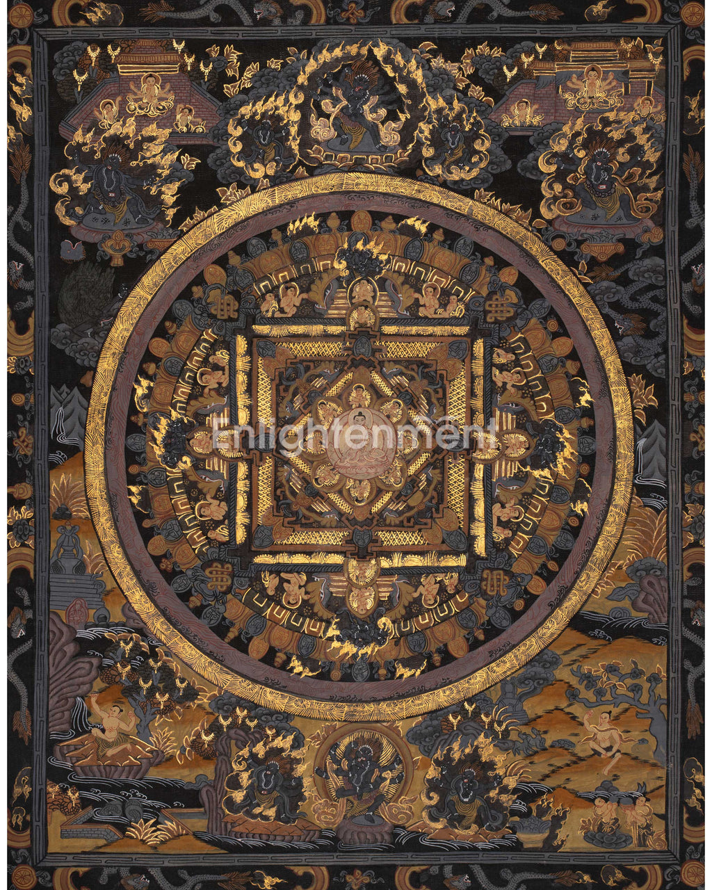The Vintage Buddha Mandala, created in the 1980s, features gold accents set against a deep black background, symbolizing wealth and mystery while invoking ancient spiritual traditions. Its intricate design, centered around the figure of the Buddha, represents wisdom, compassion, and spiritual attainment, serving as a powerful symbol of enlightenment and inner peace. The presence of the Buddha within the Mandala inspires a sense of reverence and devotion, reminding viewers of the profound teachings and timeless wisdom associated with the historical Buddha.