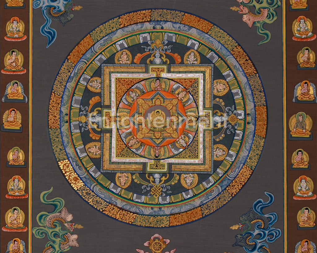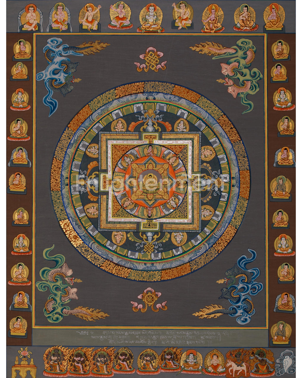 In this thangka, the Vintage Buddha Mandala showcases a beautiful arrangement of circles and sacred shapes that symbolize the universe's divine order and the path to spiritual awakening. The Buddha, representing the still point of peace amid the movement of existence, sits at its center. Surrounding him are layers of deities, lotus petals, and protective symbols that reflect the stages of meditation and realization. The outer circles, with vibrant colors and sacred motifs, symbolize harmony between the cosmic and inner self. The golden patterns create a captivating depth, drawing viewers inward toward the heart of enlightenment.