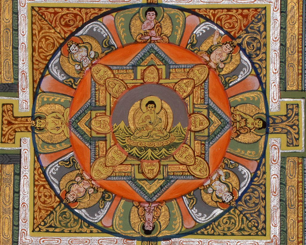 Immerse yourself in the meditative beauty of this Vintage Buddha Mandala Painting, a timeless hand-painted thangka created by a skilled Nepali artist. Painted on fine cotton canvas using acrylic colors and genuine 24K gold, this thangka radiates divine elegance and sacred geometry. The acrylic pigments offer brilliant clarity, while the gold accents illuminate each intricate detail of the mandala, symbolizing spiritual enlightenment and perfection. Created in the traditional Tibetan style, this artwork reflects the highest level of devotion and precision, embodying both artistic mastery and profound spiritual significance.