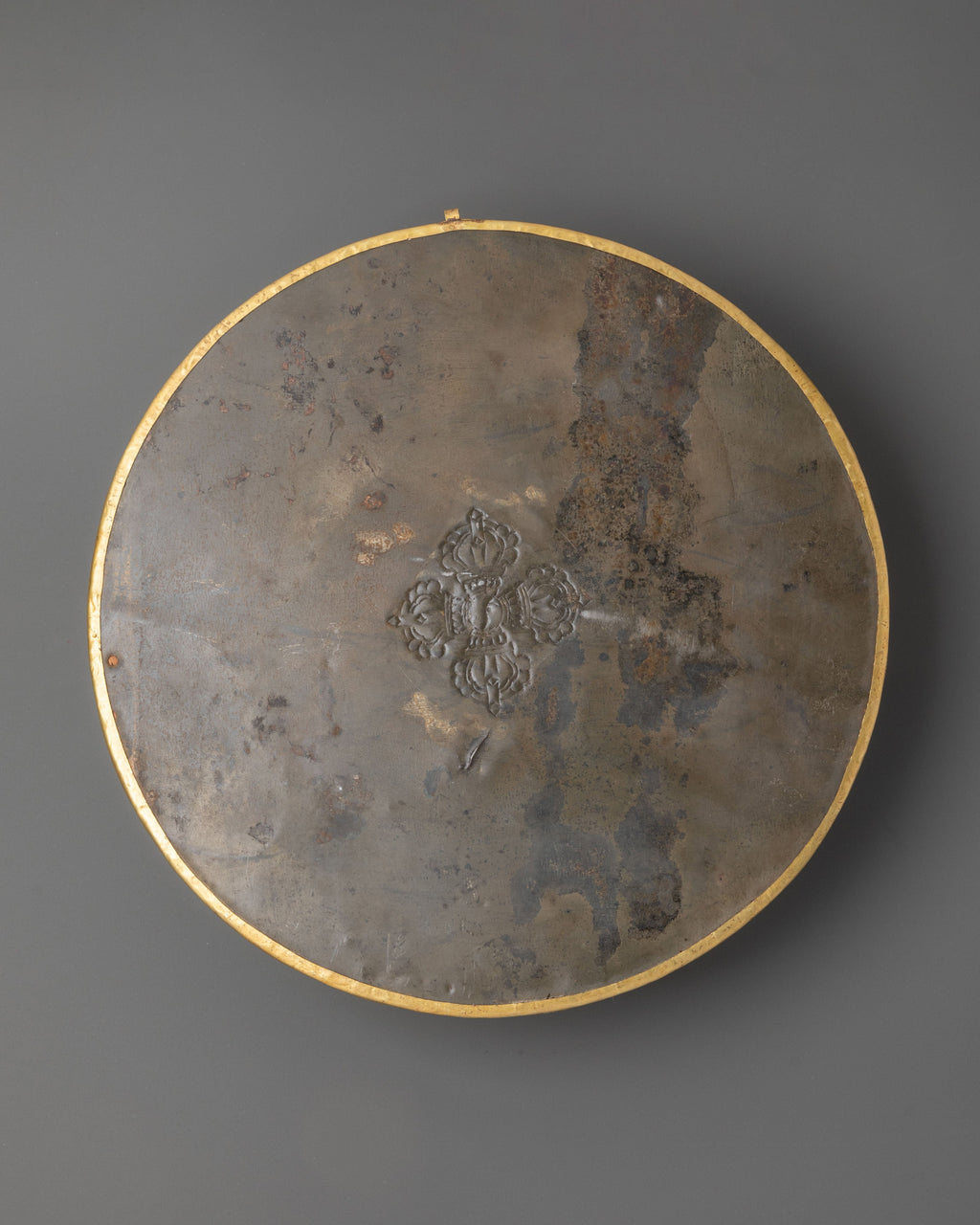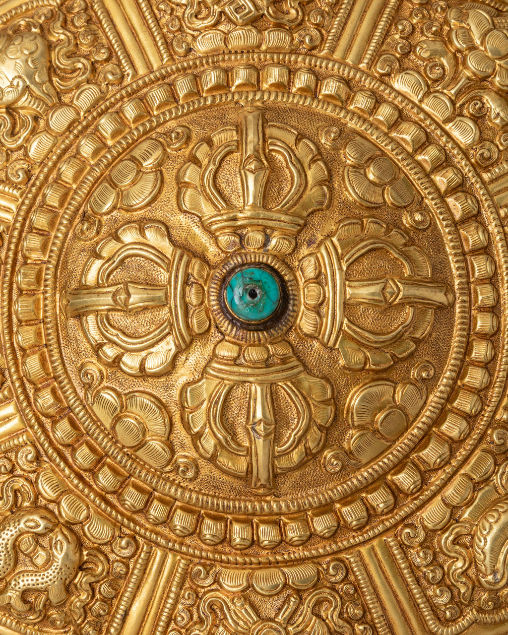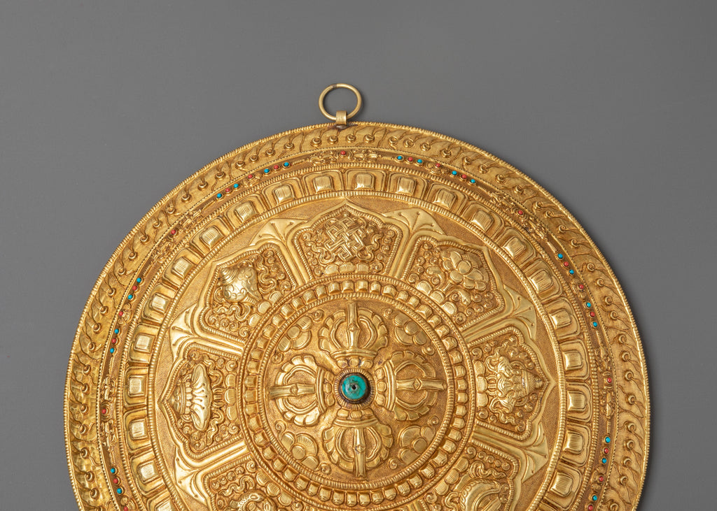 This wall hanging features Tibetan motifs, intricate patterns, and turquoise stones, which are traditionally thought to give spiritual healing and protection. Turquoise is regarded as a significant stone in Tibetan culture, representing spiritual balance, emotional healing, and protection against evil forces. The piece's brass body provides a grounded, earthy appearance, while the brilliant turquoise stones give a pop of color and uplifting energy. The artwork is both a decorative item and a spiritual emblem, bringing tranquility and balance into your home. This Tibetan-inspired wall hanging is perfect for creating a spiritual ambiance in any environment. This wall hanging, whether placed in your living room, meditation space, or shrine, will provide a sense of calm and safety.