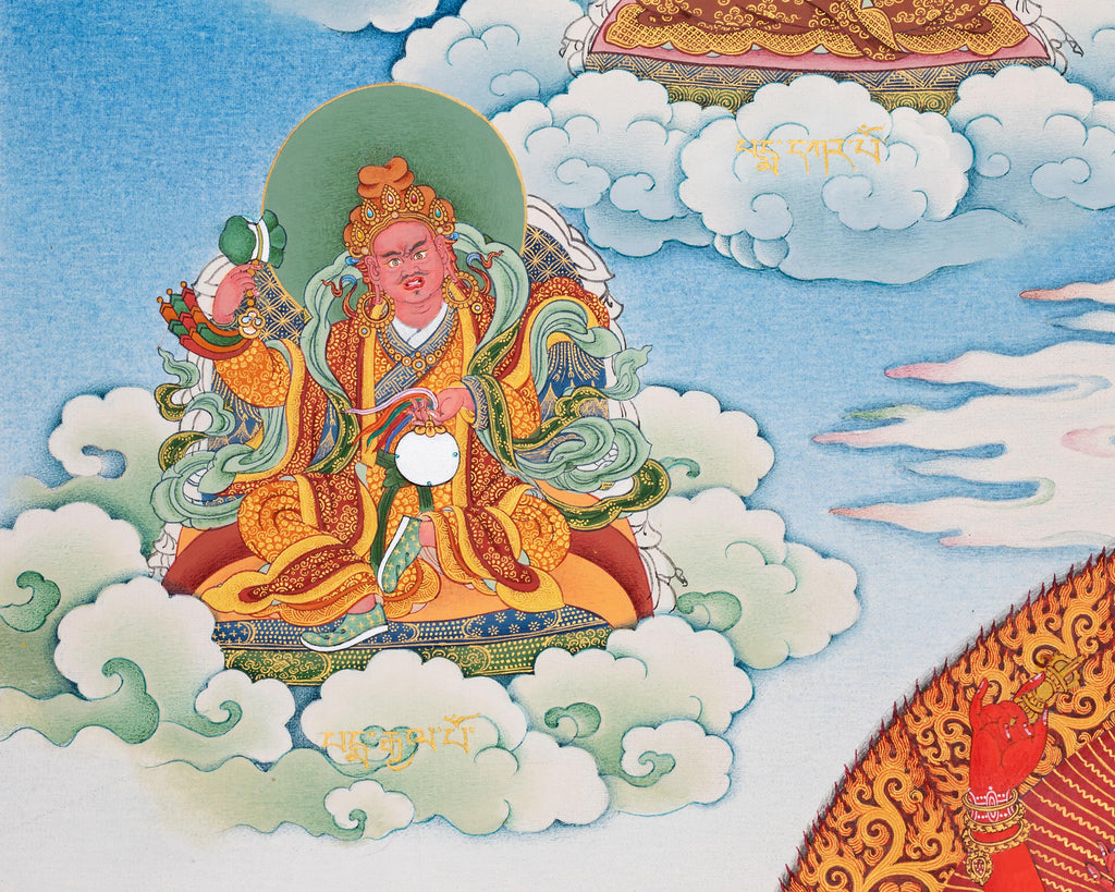 This Wangdu Thangka was commissioned and created for the first time at Enlightenment Studio, Kathmandu, in close consultation with the head lamas of Nangchen Tsechu Gompa, the seat of the Adeu Rinpoches. The composition is based directly on the Wangdu prayer composed by the 8th His Eminence Trulshik Adeu Rinpoche, ensuring both textual and iconographic accuracy.