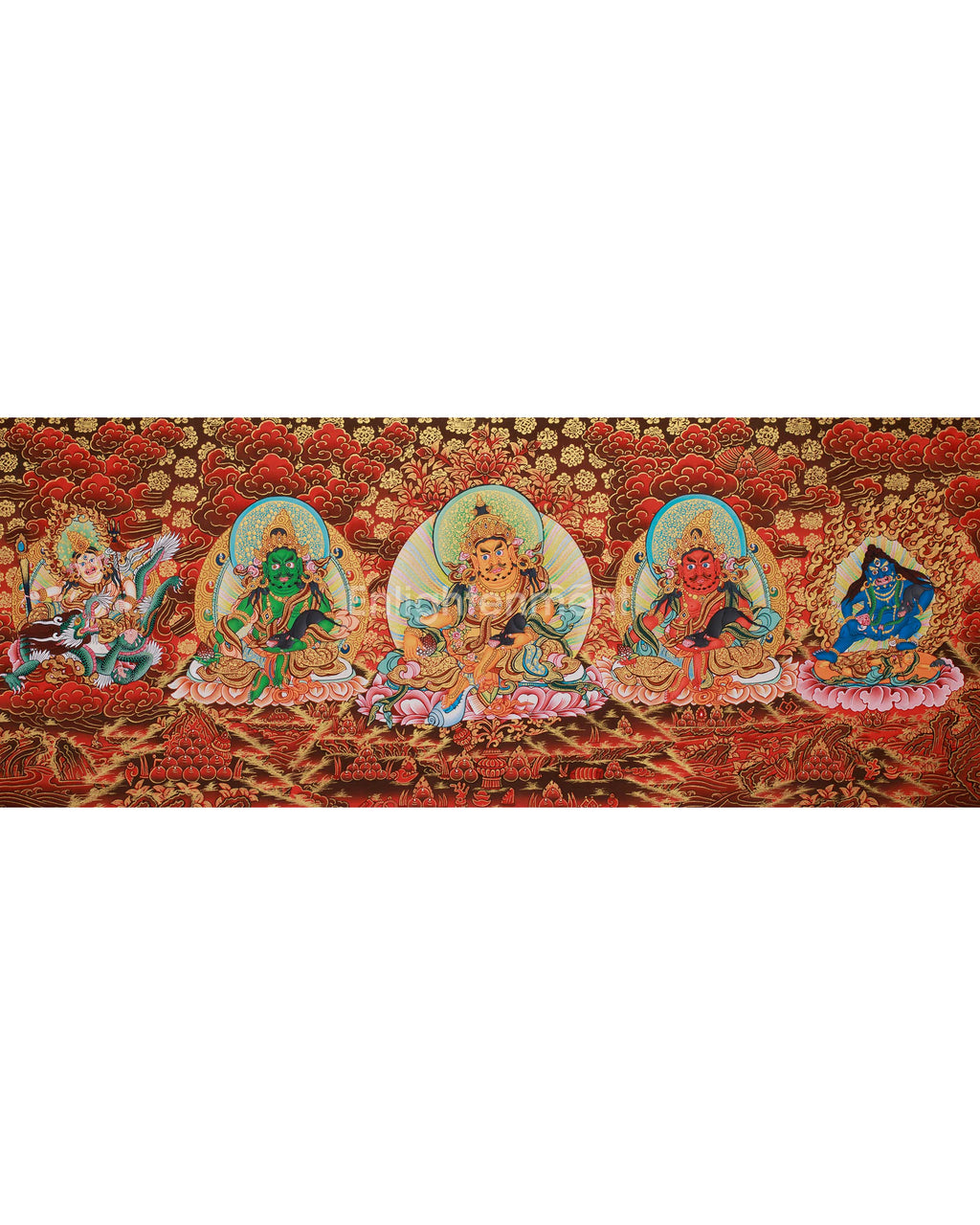 The thangka of the Buddhist wealth deities beautifully illustrates the Five Dzambhalas, cherished as the protectors of fortune, abundance, and prosperity in Tibetan Buddhism. The vibrant red and gold palette enhances each element, while the deities are highlighted in their unique colors. This artwork is skillfully handcrafted on premium cotton canvas, with meticulous acrylic painting and authentic 24K gold, vividly bringing each deity to life. The horizontal layout illustrates five dzambhalas, each granting distinct blessings of wealth, protection, and spiritual wellness. This artwork, rendered in the traditional Tibetan style, showcases exceptional brushwork that reflects both artistic mastery and profound spiritual meaning.