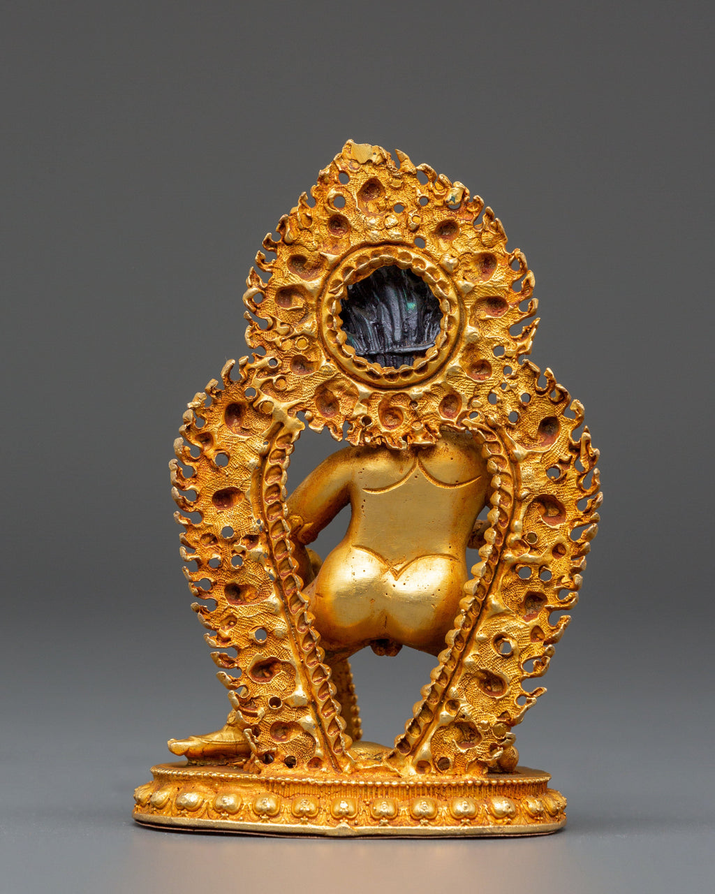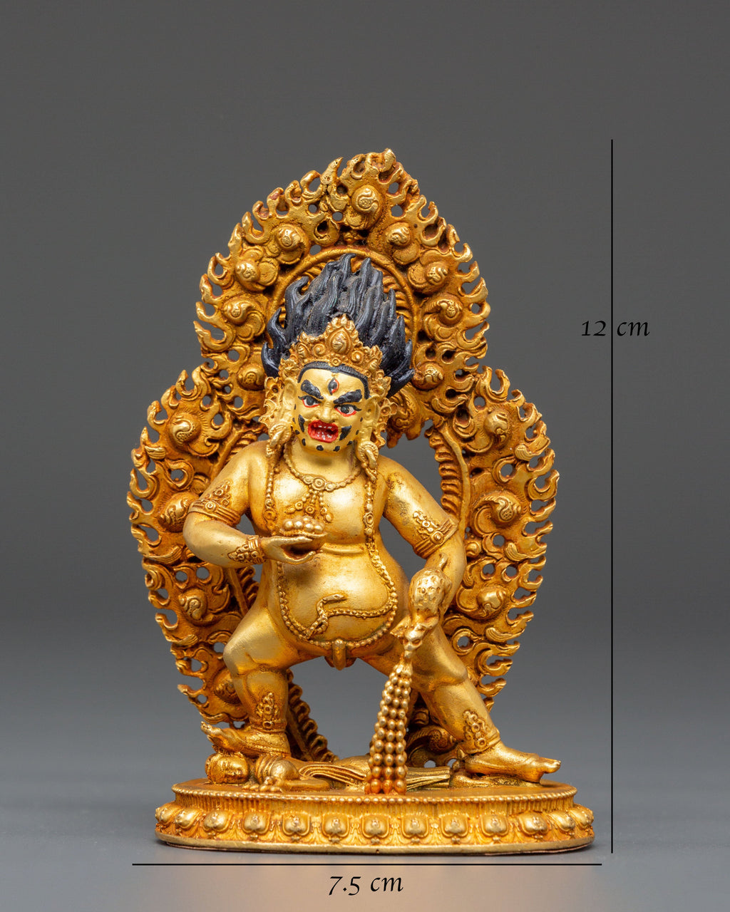 The Wealth Guardian Black Dzambhala Statue is 12cm in height, 7.5cm in breadth, and weighs 0.728kg. This statue, made of copper and plated in gold, depicts Black Dzambhala, the famous Tibetan deity of wealth and success. Black Dzambhala, known for his ability to eliminate money barriers and bring plenty, is a revered figure for people seeking spiritual and material success. This exquisitely carved statue is ideal for altars, meditation rooms, or sacred places, adding both visual appeal and spiritual importance.
