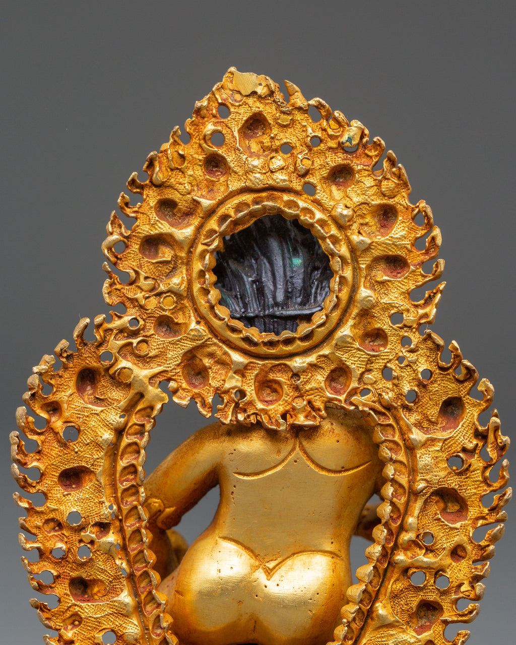 The Wealth Guardian Black Dzambhala Statue is handcrafted with meticulous features, highlighting the deity's dominating presence, seated position, and traditional symbolic aspects. The gold plating adds to the spiritual aura, while the copper body provides a rich, earthy tone that showcases the sculpture's intricate design. Every detail of the statue, from Dzambhala's facial expression to the decorative motifs, represents riches, protection, and spiritual advice, making it an important addition to any spiritual collection or sacred area. This Wealth Guardian Black Dzambhala Statue is a spiritual instrument as well as a decorative piece, making it ideal for practitioners looking to attract wealth, protection, and abundance.
