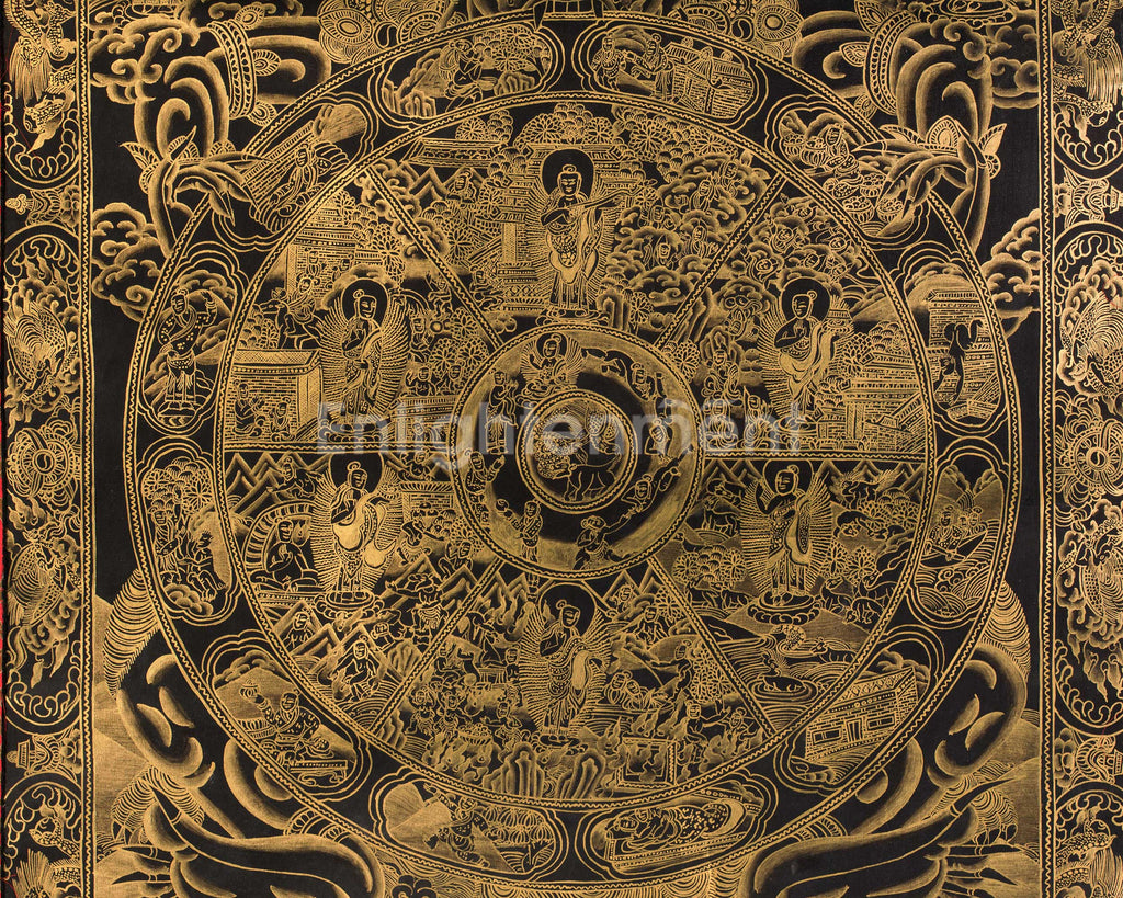 This exquisite Wheel of Life (Bhavacakra) Thangka beautifully illustrates the cycle of samsara and the impermanence of existence, rendered in rich gold on a black canvas. The intricate artwork features a grand composition, with the Wheel of Life serving as the central motif, symbolizing the eternal cycle of birth, death, and rebirth.