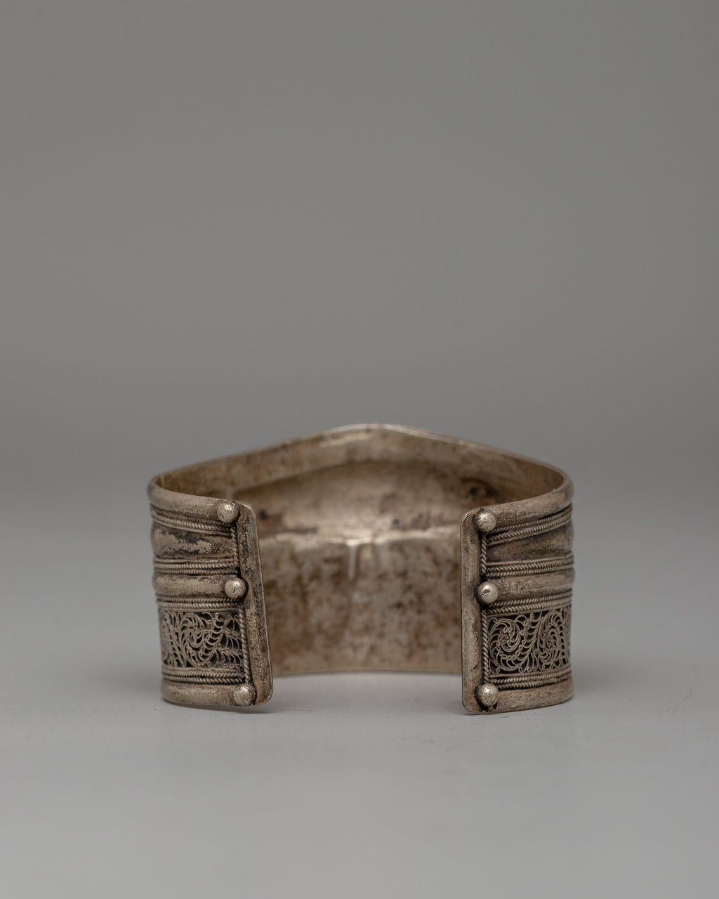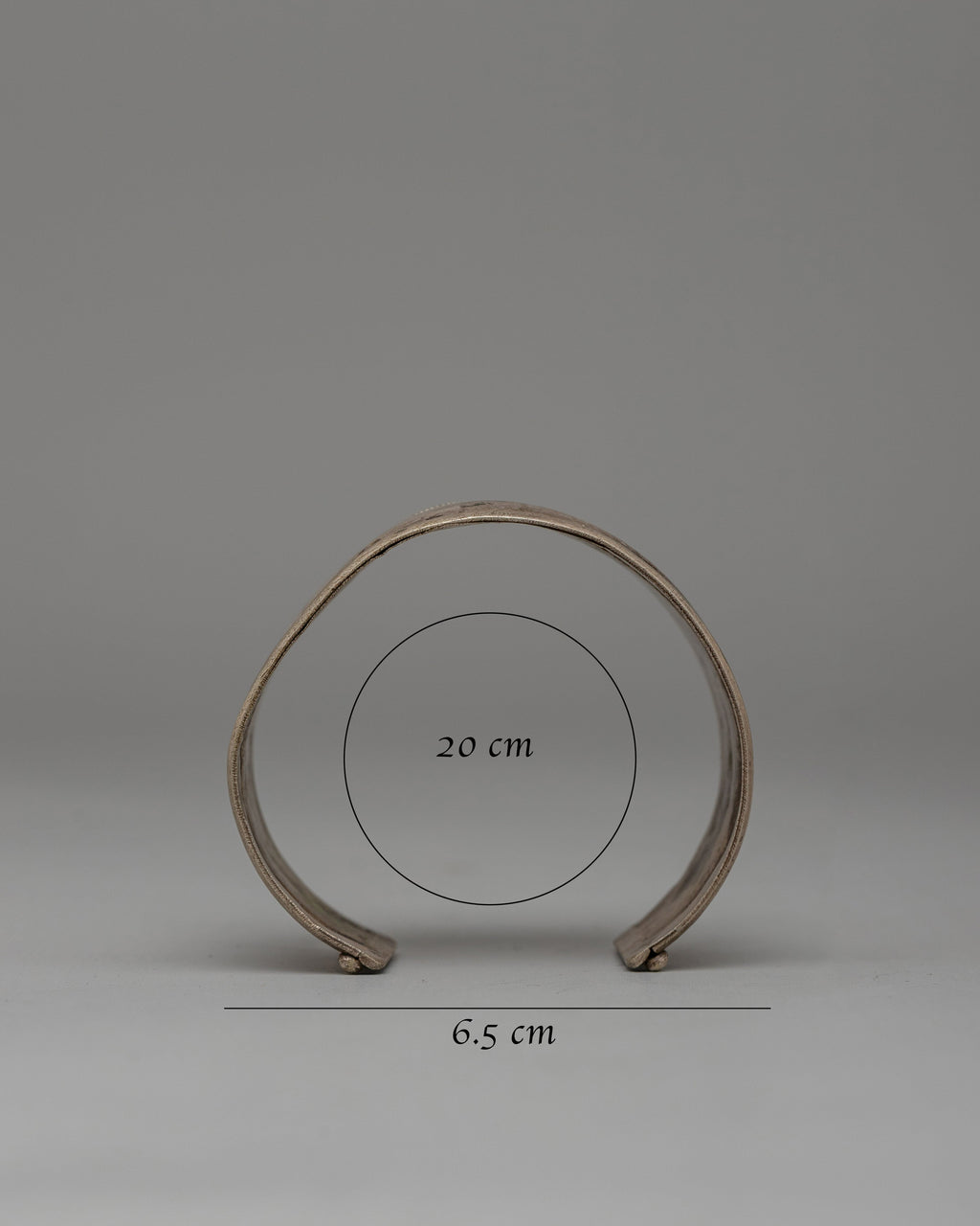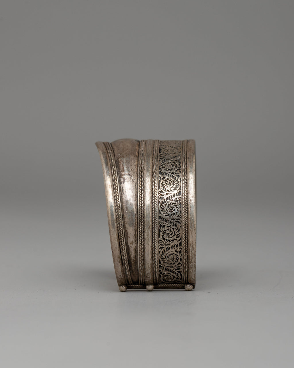 With dimensions of 4 cm in height, 6.5 cm in breadth, and 20 cm in diameter, this bracelet is an example of expertly crafted jewelry. It is made of white metal, with a distinctive patina that adds to its vintage elegance, and weighs only 0.034 kg. This filigree bracelet's classic style and cultural importance will make it an attractive addition to your jewelry collection or a considerate present for a special someone.