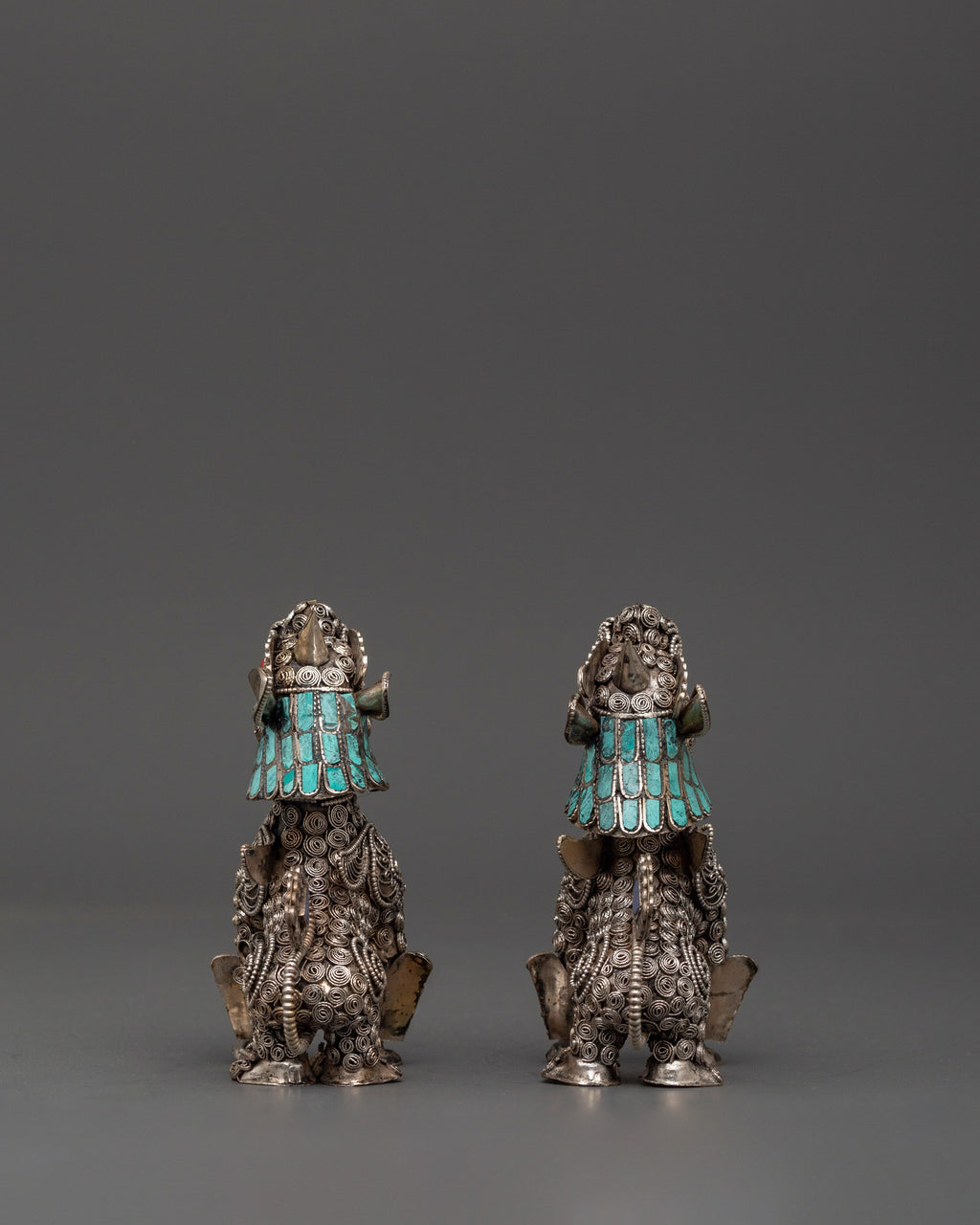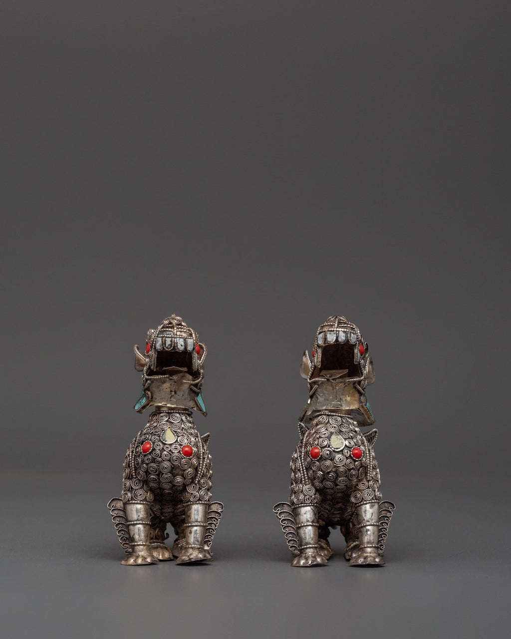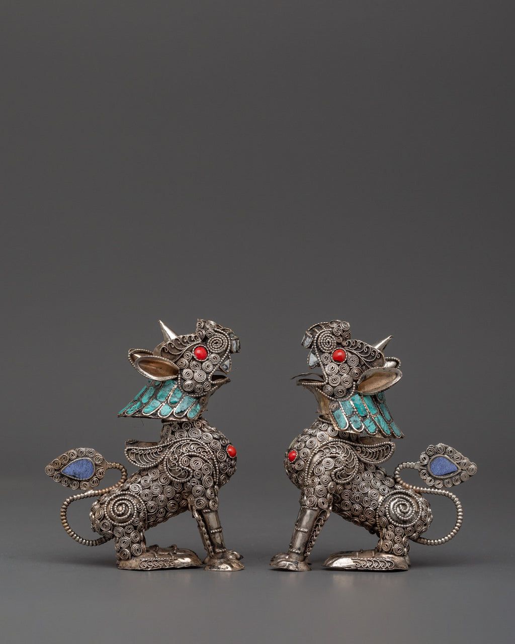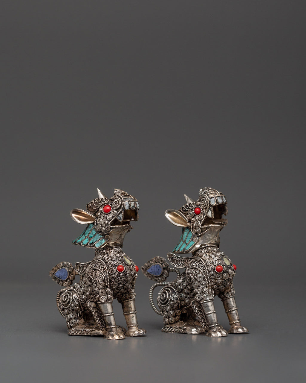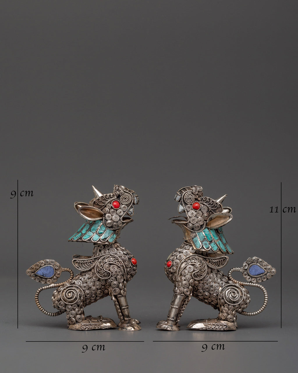 This intricately crafted White Metal Guardian Lion Statue Set, featuring stones of coral, turquoise, and lapis lazuli, will add powerful symbolism and striking detail to your environment. These protective lion figurines, steeped in Tibetan tradition, are designed to ward off negative energy and promote peace. Each statue measures approximately 11 cm in height and 9 cm in width, making it an ideal addition to altars, meditation spaces, or home décor displays. The horn on the forehead is a distinctive feature, representing spiritual insight and supernatural protection.