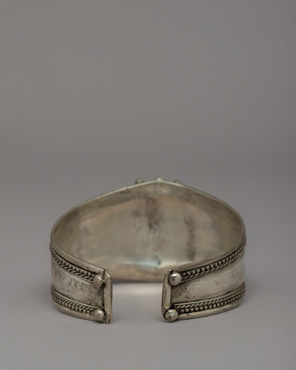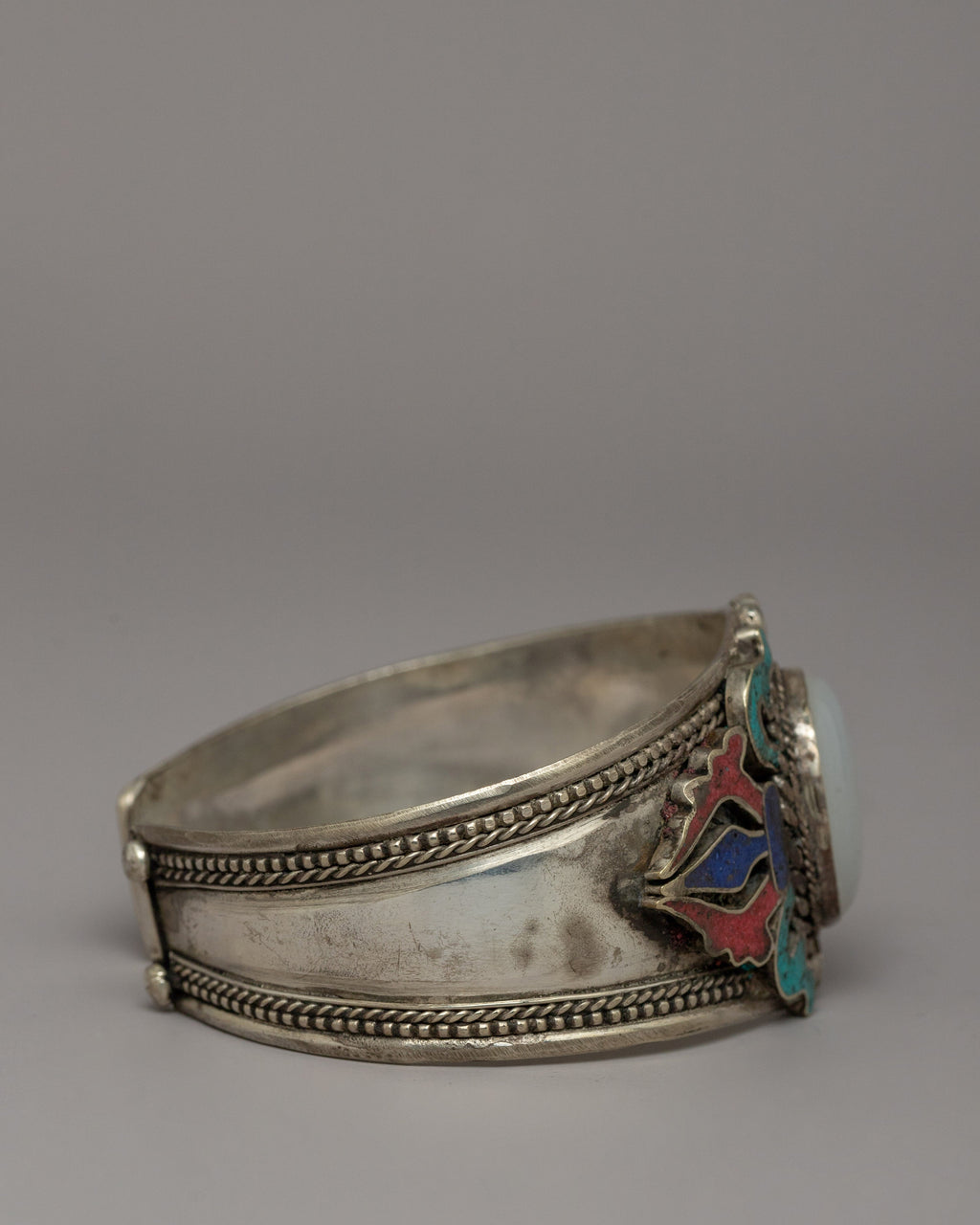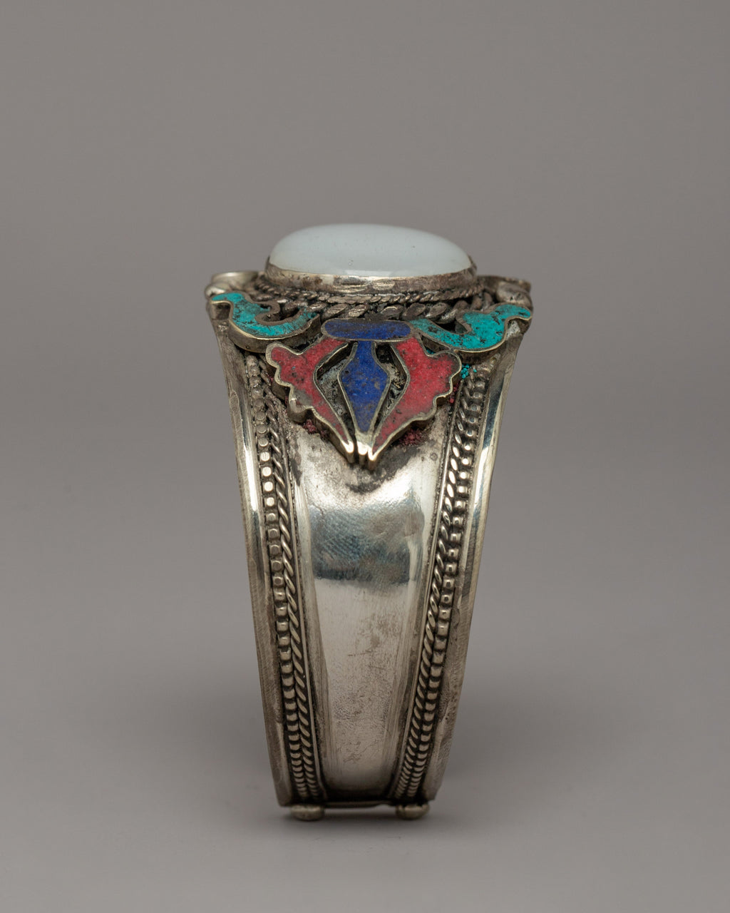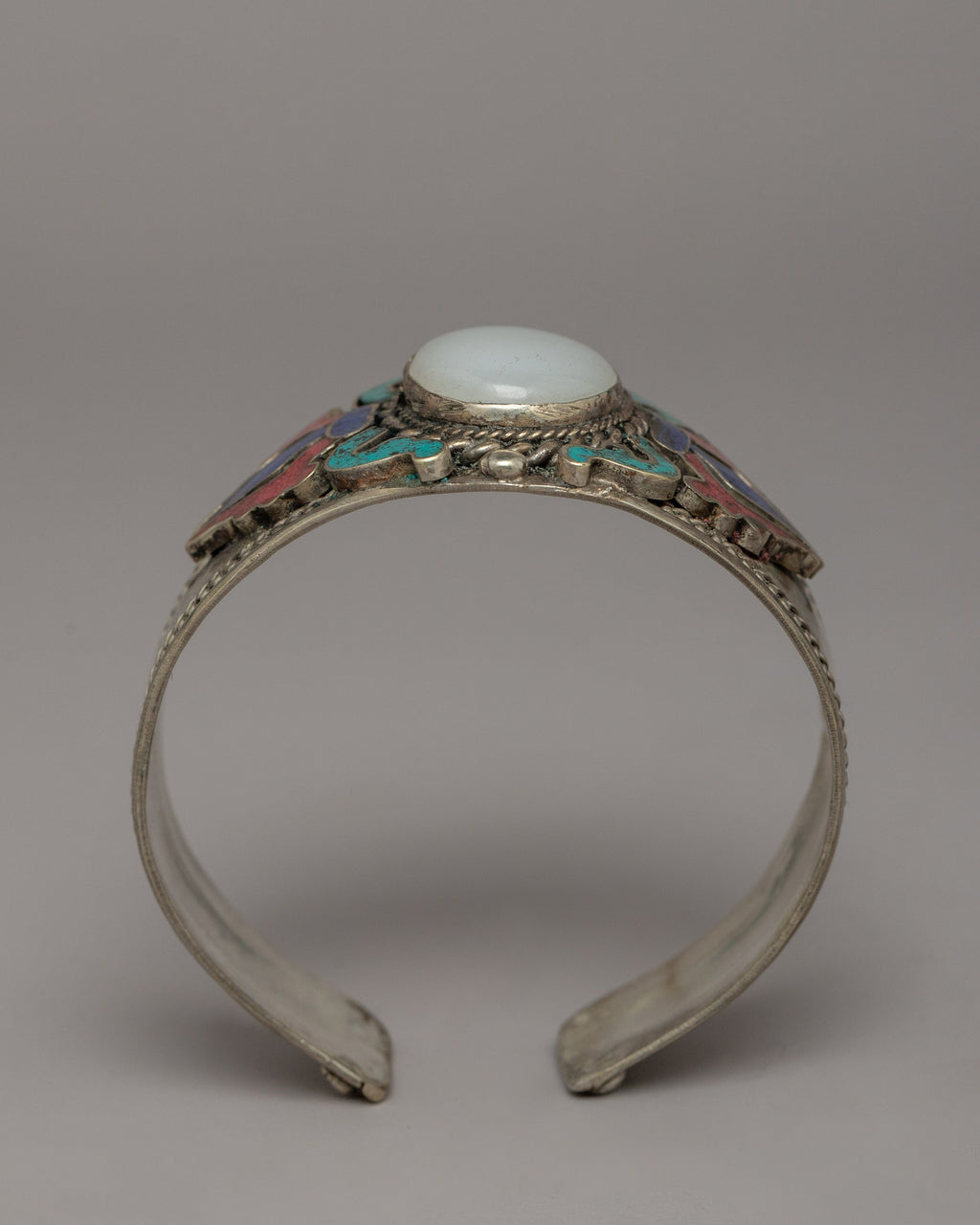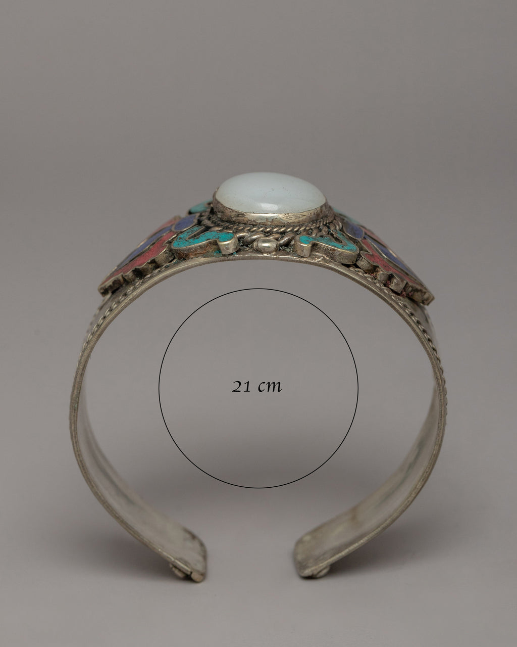 This beautifully created white metal bracelet is adorned with coral, turquoise, and lapis lazuli, creating an exclusive combination of spiritual and visual beauty. The bracelet has a height of 3.7 cm and a diameter of 6.5 cm, making it suitable for a 21 cm circumference. It weighs only 0.034 kilograms, making it light enough for everyday wear while still making a statement. The addition of these healing stones improves the bracelet's spiritual powers.