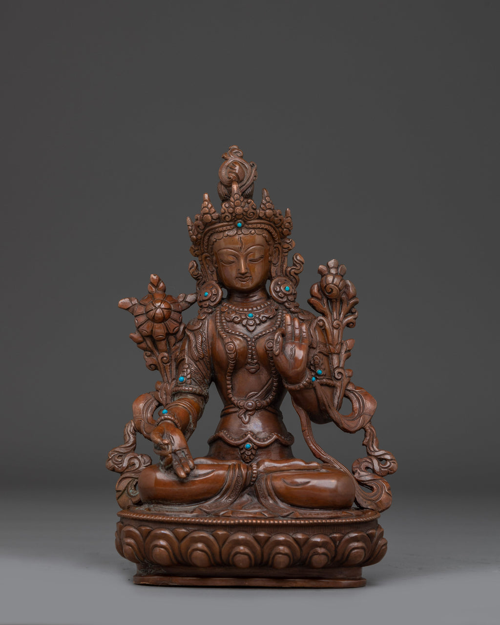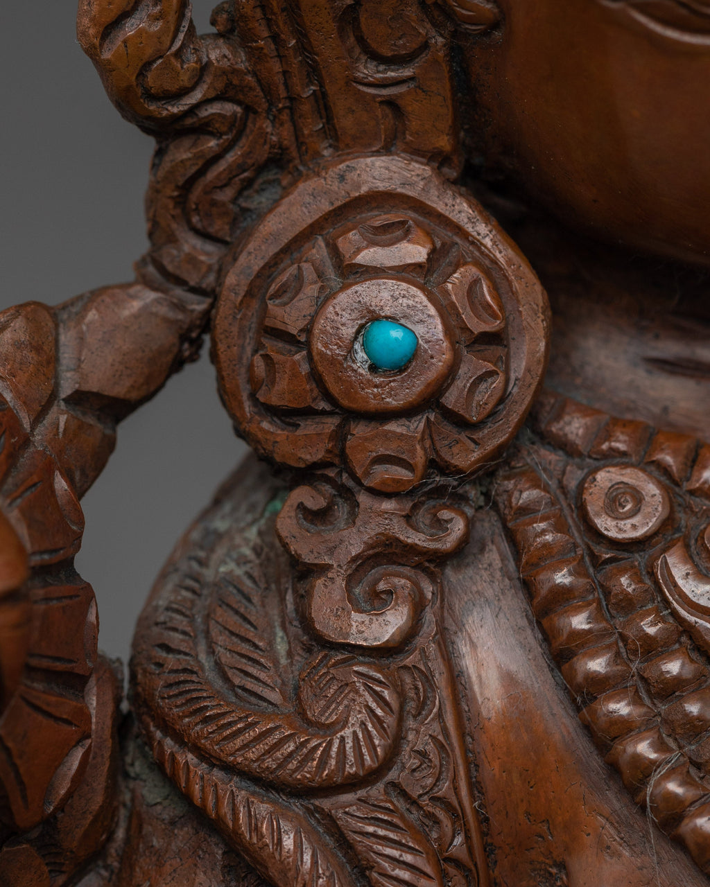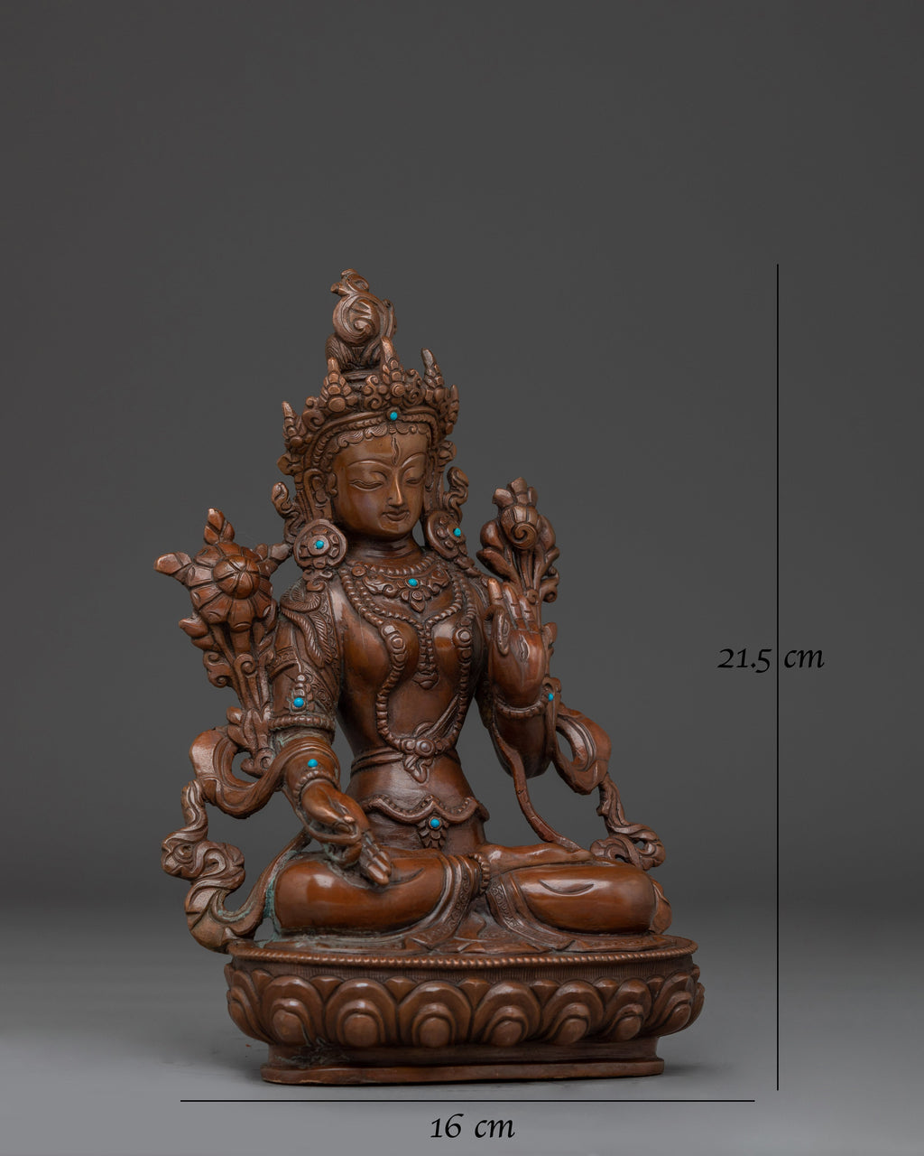 White Tara, Bodhisattva of Healing, measures 8.5 inches (21.5 cm) in height with a 6.3-inch (16 cm) base and weighs 1.77 kg. Made from oxidized copper, it features carefully inlaid gemstones that enhance its intricate details and spiritual significance. The combination of sturdy material and decorative accents makes it a meaningful and lasting piece for any sacred or decorative space.