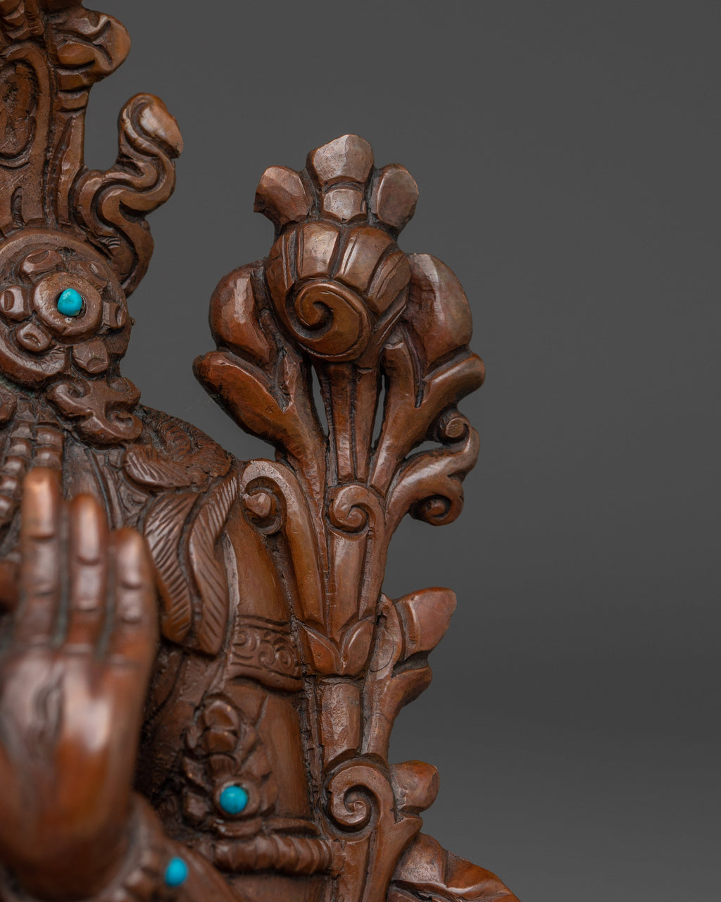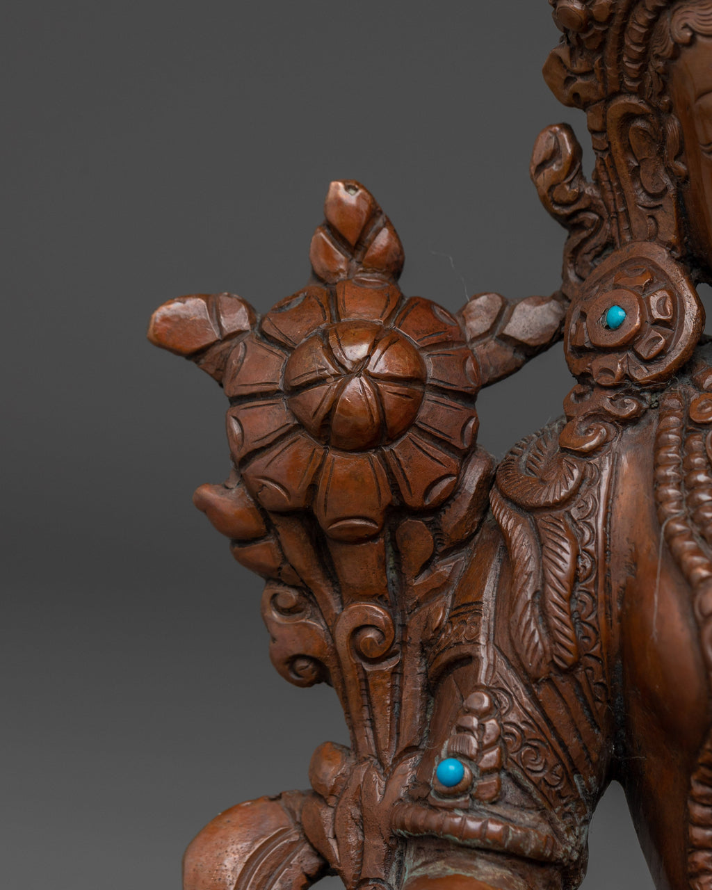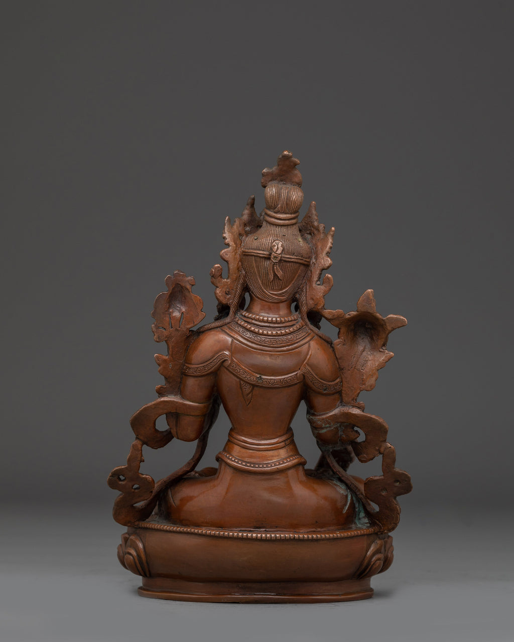 White Tara, Bodhisattva of Healing, measures 8.5 inches (21.5 cm) in height with a 6.3-inch (16 cm) base and weighs 1.77 kg. Made from oxidized copper, it features carefully inlaid gemstones that enhance its intricate details and spiritual significance. The combination of sturdy material and decorative accents makes it a meaningful and lasting piece for any sacred or decorative space.