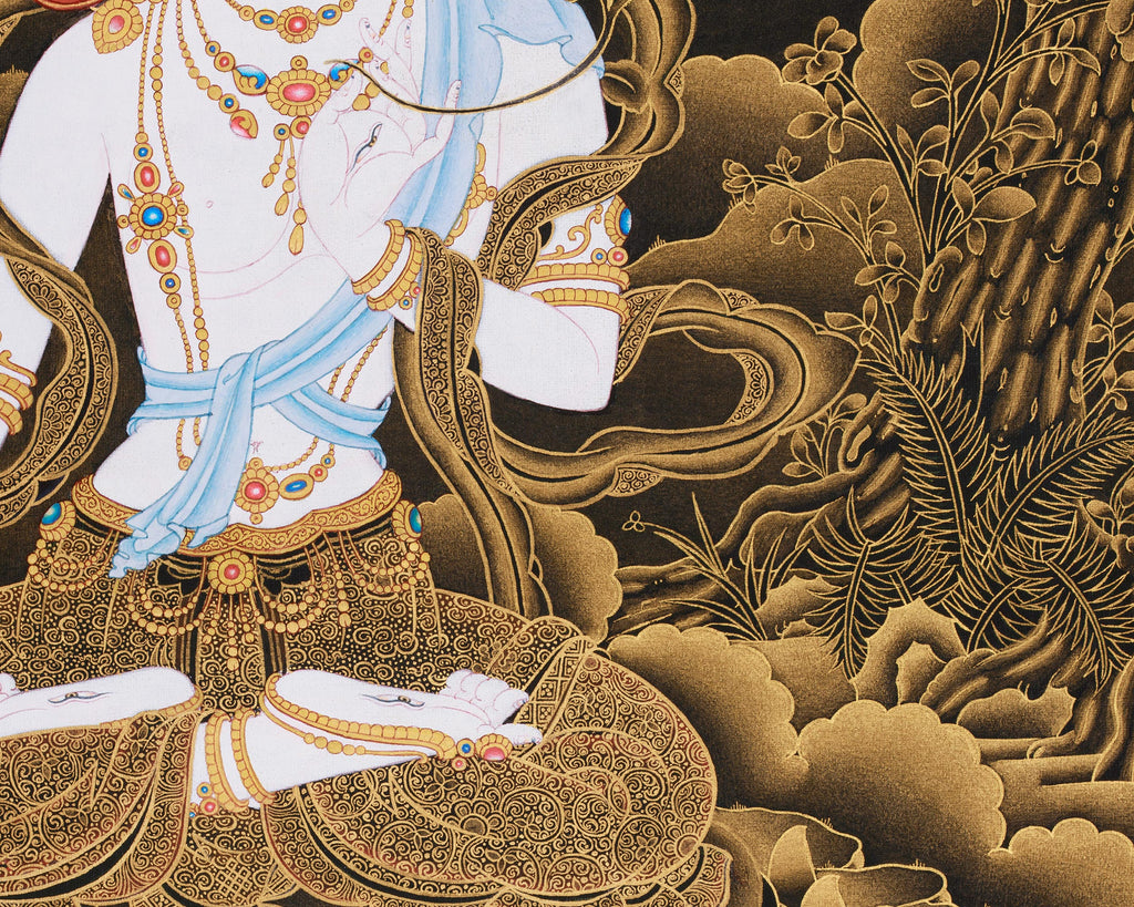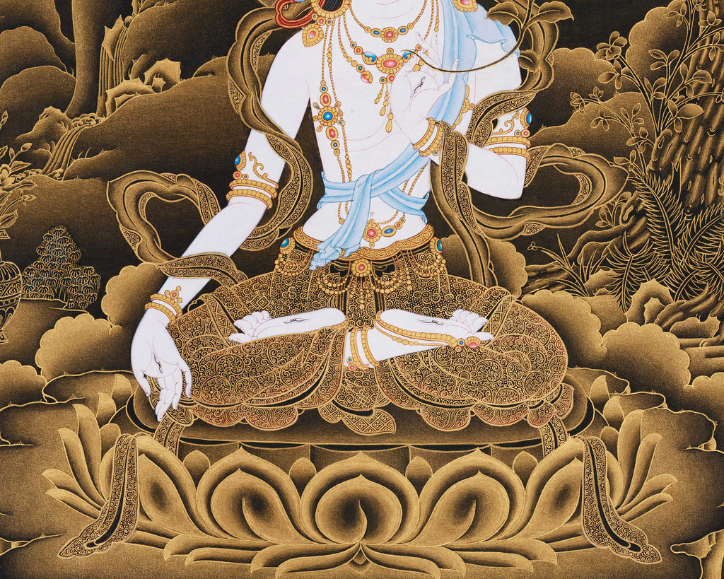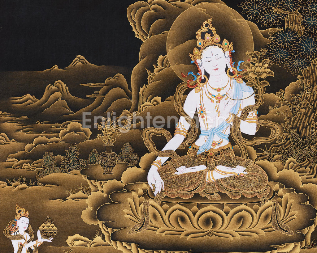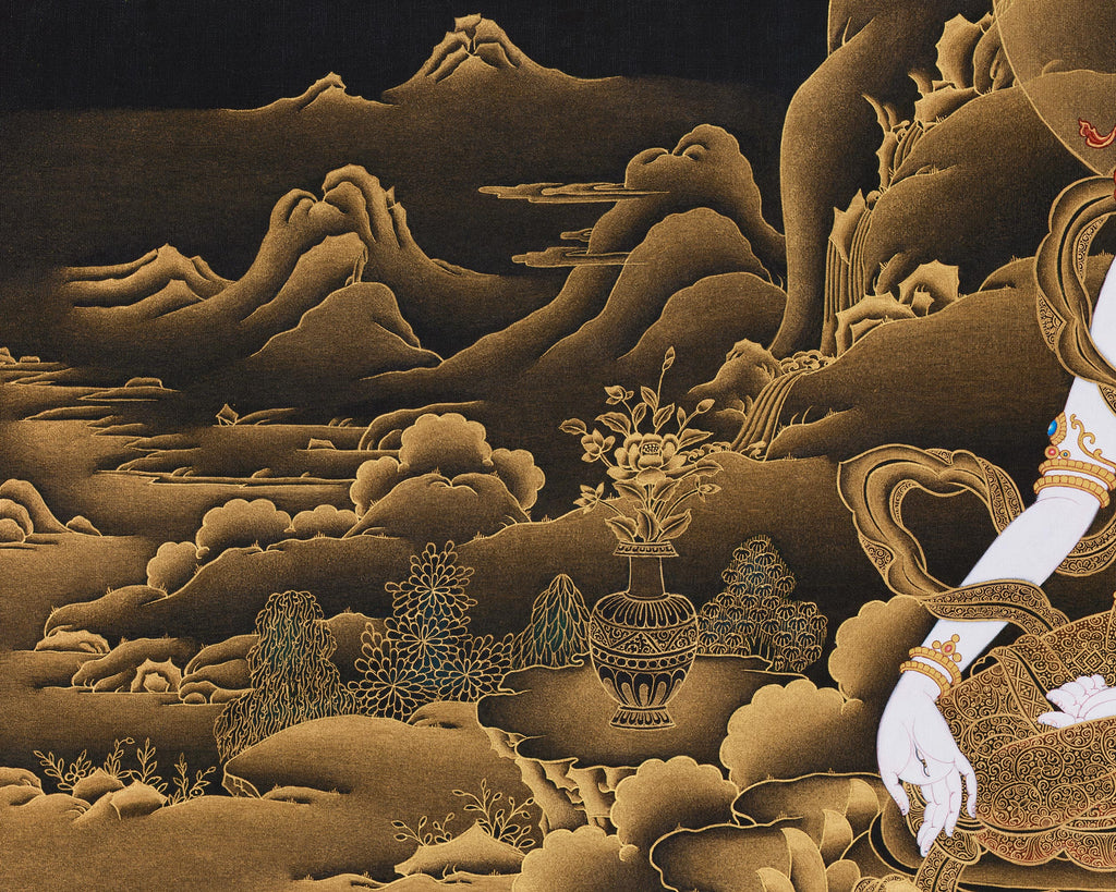 In this painting, she is shown seated elegantly on a blooming lotus throne; her serene white form exudes divine purity. Her right hand is extended downward in varada mudra, symbolizing generosity, while her left hand holds a blooming flower. Adorned in golden ornaments and delicate silks, her presence glows against the black background, embodying calm strength and eternal light. At the base of the thangka, offering goddesses present ritual gifts and lotus blooms, symbolizing reverence and devotion. The golden mountains, rivers, and clouds surrounding her shimmer with a dreamlike luminosity, creating a tranquil spiritual atmosphere that draws the viewer into deep contemplation.