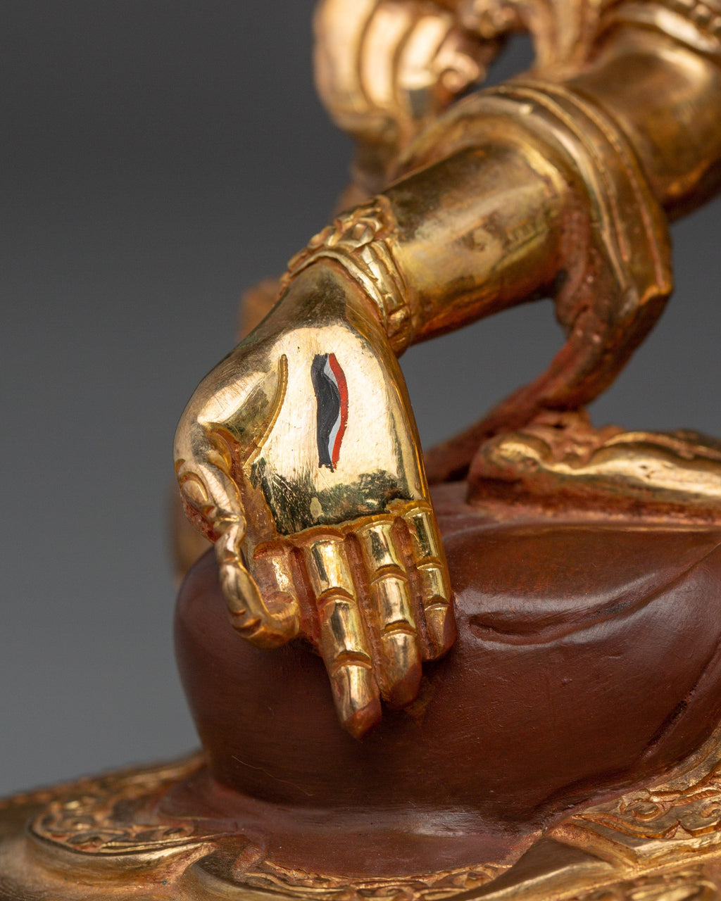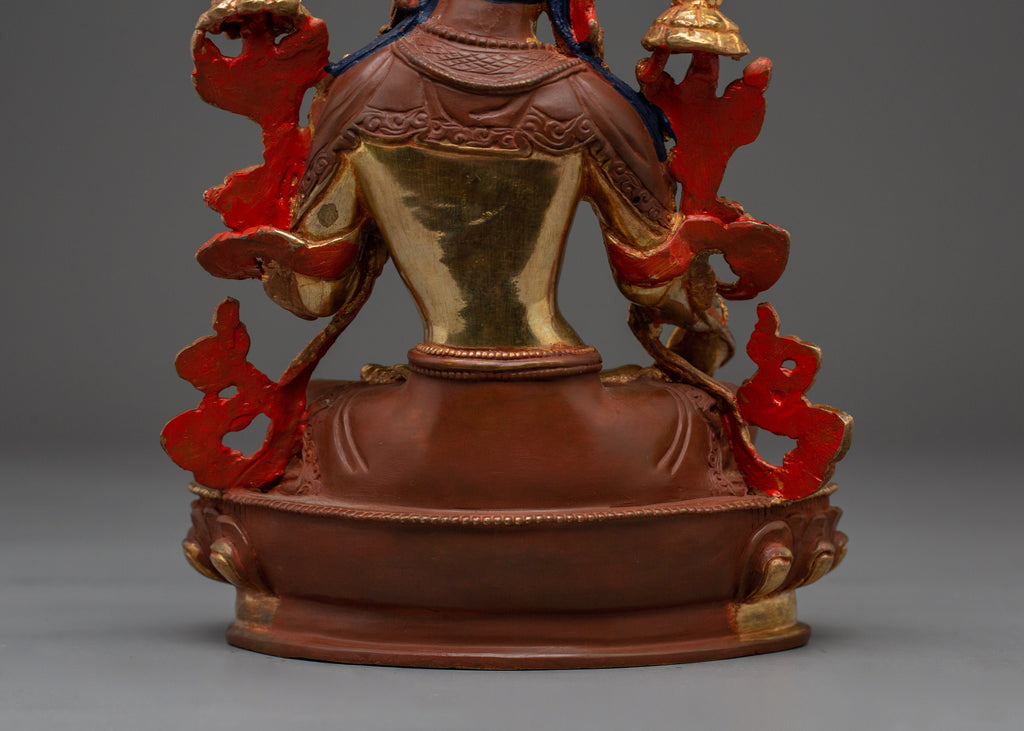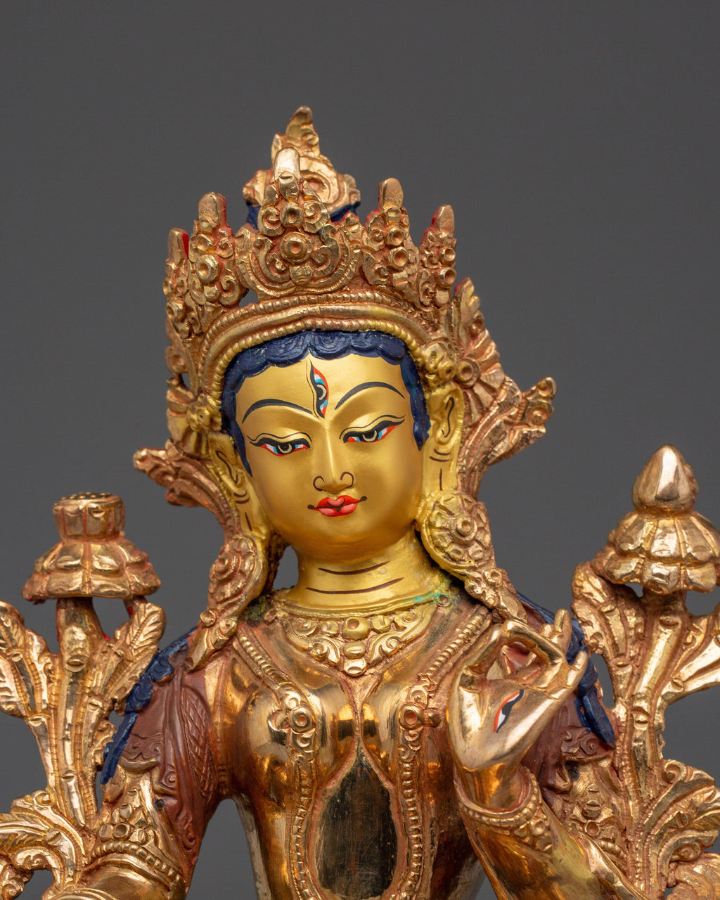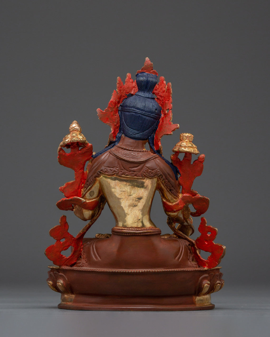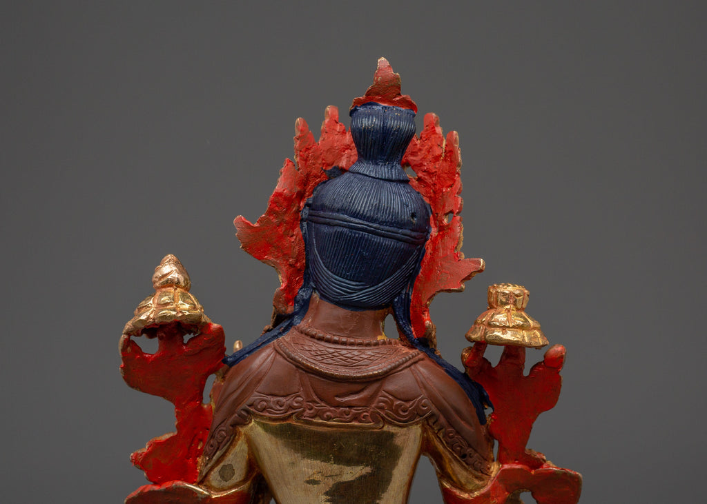 Crafted from copper and carefully gilded, the White Tara Buddha Statue with 24K gold is a stunning statue. Any room is enhanced by the exquisite details, such as the elaborate acrylic and gold paints on her crown and clothing, which lend a brilliant beauty. This statue, which stands 9.1" (23 cm) tall and weighs 1.69 kg, is the perfect size for your altar, home shrine, or meditation space.
