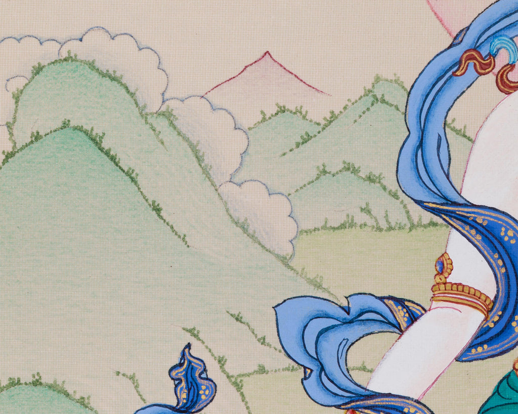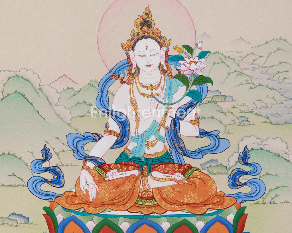White Tara, the divine mother embodying compassion and longevity, emerged from Avalokiteshvara's tears to aid all beings in overcoming suffering, illness, and emotional burdens. Revered in Tibetan Buddhism as a symbol of peaceful wisdom, healing energy, and blessings for life, she is depicted here with her signature seven eyes—on her face, palms, and soles—representing her ability to see the suffering of all sentient beings. Seated gracefully on a lotus throne, White Tara holds a blooming lotus in her left hand, while her right hand extends in a gesture of giving and protection. Her radiant white form emanates purity, complemented by her flowing blue scarf and golden garments shimmering with 24K gold accents. The tranquil landscape of soft mountains and gentle greenery behind her transforms this thangka into a serene sanctuary of peace, healing, and compassion.