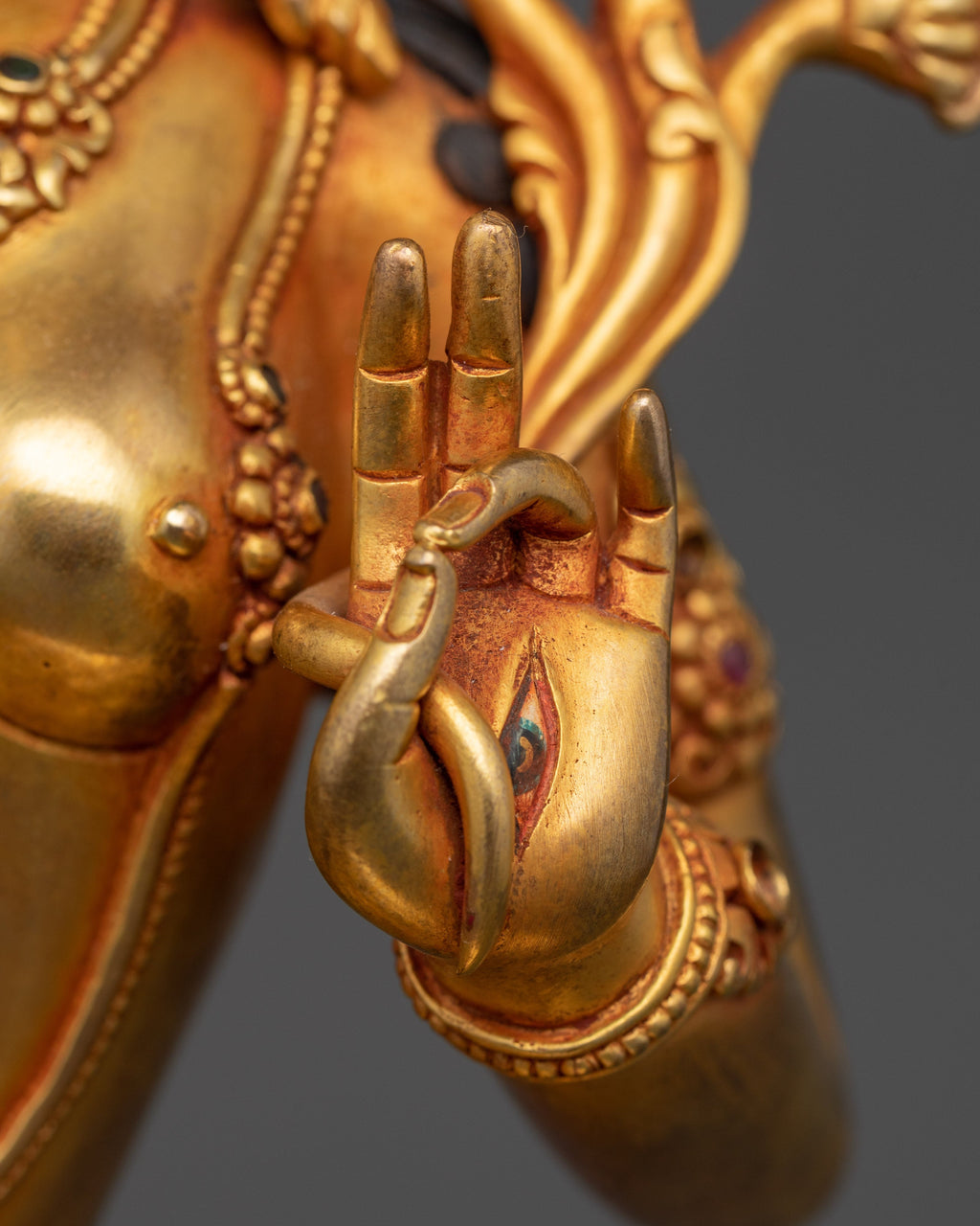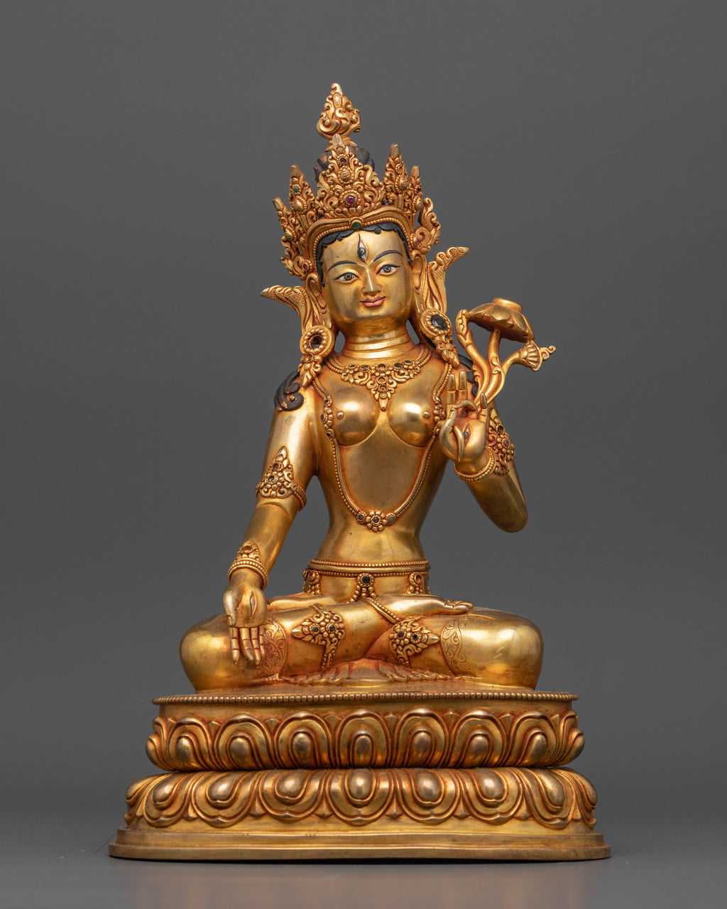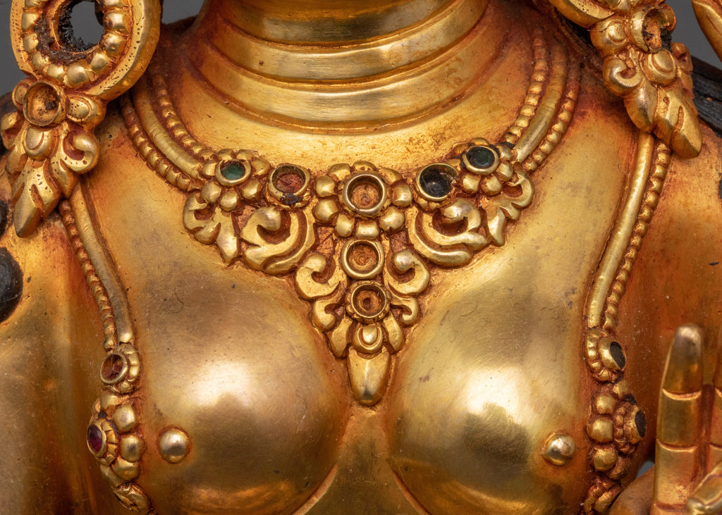 This magnificent monument was created by talented craftspeople in Patan, Nepal, a place renowned for its long history of superb craftsmanship and metalworking. The statue, whose body is made of copper and is gilded with 24K gold, has a heavenly shine that highlights its spiritual significance. White Tara's serene demeanor, elegant stance, and the lotus foundation she sits on are all further highlighted by the exquisite acrylic and gold paintings. Every element has been painstakingly designed to capture the deep beauty and sympathetic essence of this adored god.