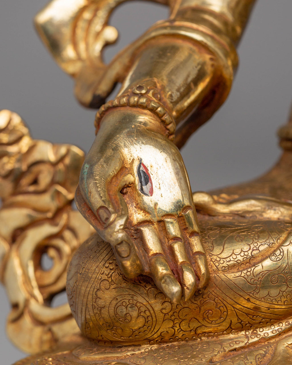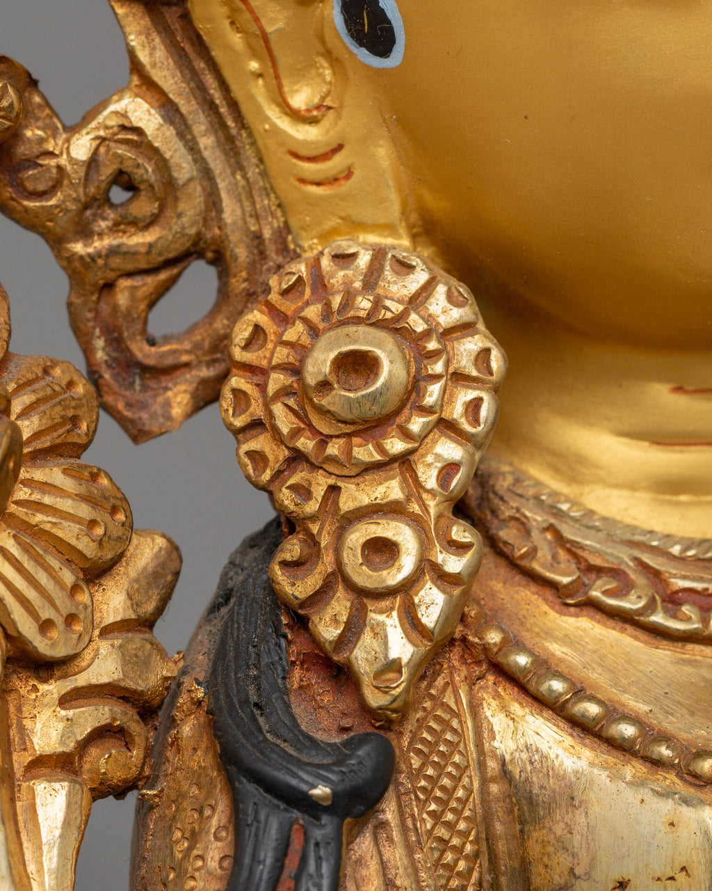 The design of the White Tara statue highlights the serene and graceful nature of the deity, seated in a meditative posture with seven eyes symbolizing her ability to see all beings in need of compassion and healing. The 24K gold gilding enhances the statue’s radiance, symbolizing purity and enlightenment, while the acrylic colors bring vibrant life to Tara's robes and ornaments. The copper body provides a rich, earthy tone, grounding the statue while adding depth to the intricately designed details. This statue beautifully captures the essence of White Tara's compassion and divine presence.