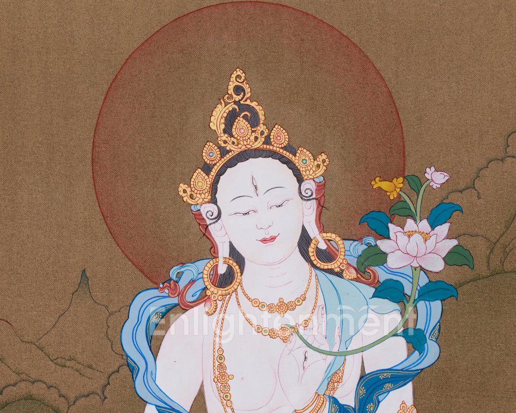 This Thangka portrays White Tara seated in the vajra posture upon a lotus seat, symbolizing purity and spiritual elevation. She holds a fully bloomed lotus flower in her left hand, representing purity and spiritual awakening, while her right hand is positioned in the gesture of supreme generosity (Varada Mudra). Her seven eyes signify her compassionate vigilance, and her tranquil expression embodies her role as a guardian and healer. It is ideal for meditation, healing practices, or as a focal point in sacred spaces, serving as a powerful symbol of compassion and longevity.