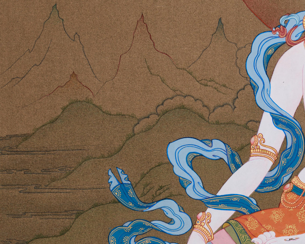 Experience the gentle grace of White Tara, the Healing Goddess, depicted in this hand-painted thangka. White Tara, a revered figure in Tibetan Buddhism, symbolizes longevity, compassion, and healing energy, representing nurturing and protection. This beautiful painting is created on cotton canvas with vivid acrylic paints, accented with gold, reflecting the refined elegance and precision of the traditional Karma Gadri style. Also called Sita Tara, White Tara is among the most cherished deities in Tibetan Buddhism. She represents compassion and long life and is often invoked for health, protection, and blessings.