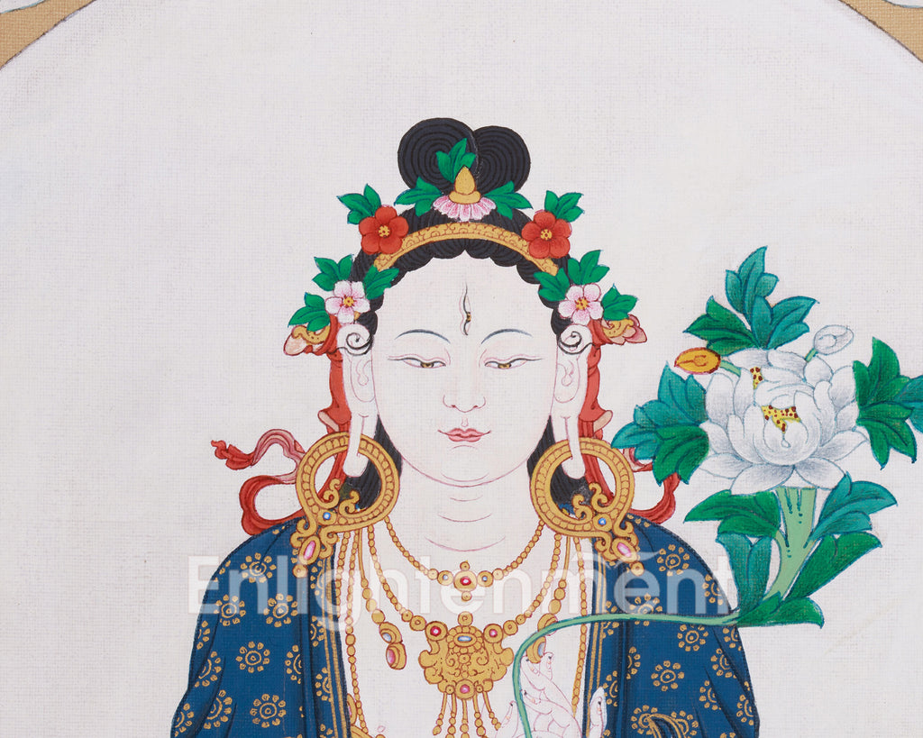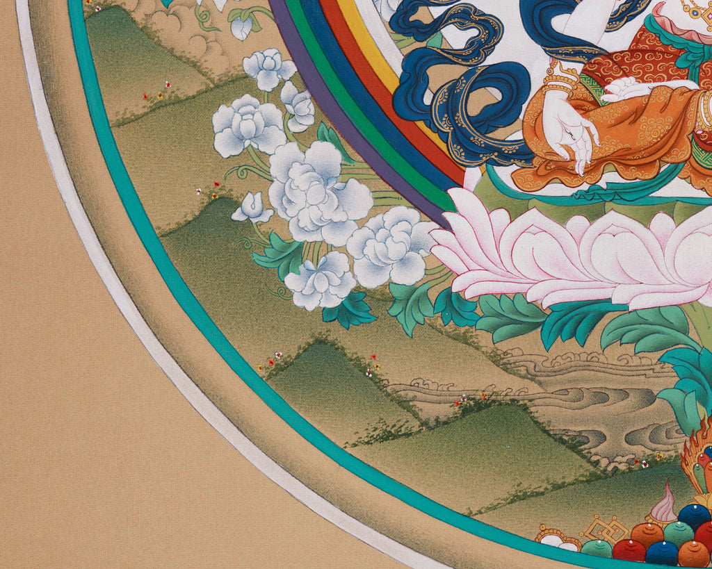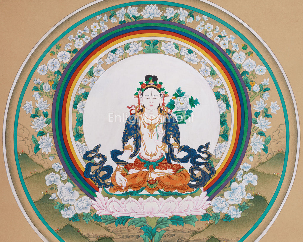 White Tara, revered as the Goddess of Healing, Longevity, and Compassion, is celebrated as the “Mother of All Buddhas.” She embodies purity and transcendent wisdom, bestowing blessings of vitality, protection from illness, and spiritual awakening. In this thangka, White Tara sits gracefully at the center of a floral and rainbow Mandala, her luminous white body adorned with a golden crown and divine ornaments. She is shown with her characteristic seven eyes—on her face, palms, and soles—representing her all-seeing compassion and vigilance over sentient beings' suffering.