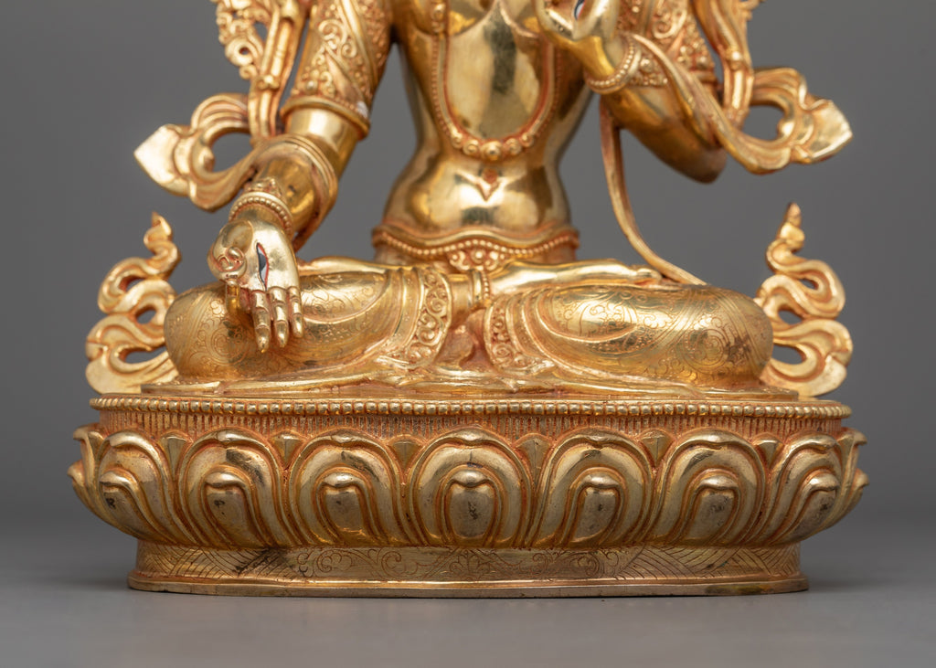 White Tara, a carefully hand-carved Buddhist deity, rests elegantly cross-legged on a double-petal lotus Seat. Her seven eyes, which represent her caring alertness, make her apart. Aside from the two usual eyes, she has a third eye on her forehead, one on each hand, and one on the soles of her feet. These distinguishing characteristics demonstrate her ability to recognize pain in all dimensions and her willingness to provide assistance and compassion to all beings.