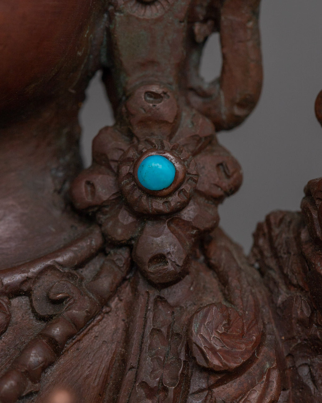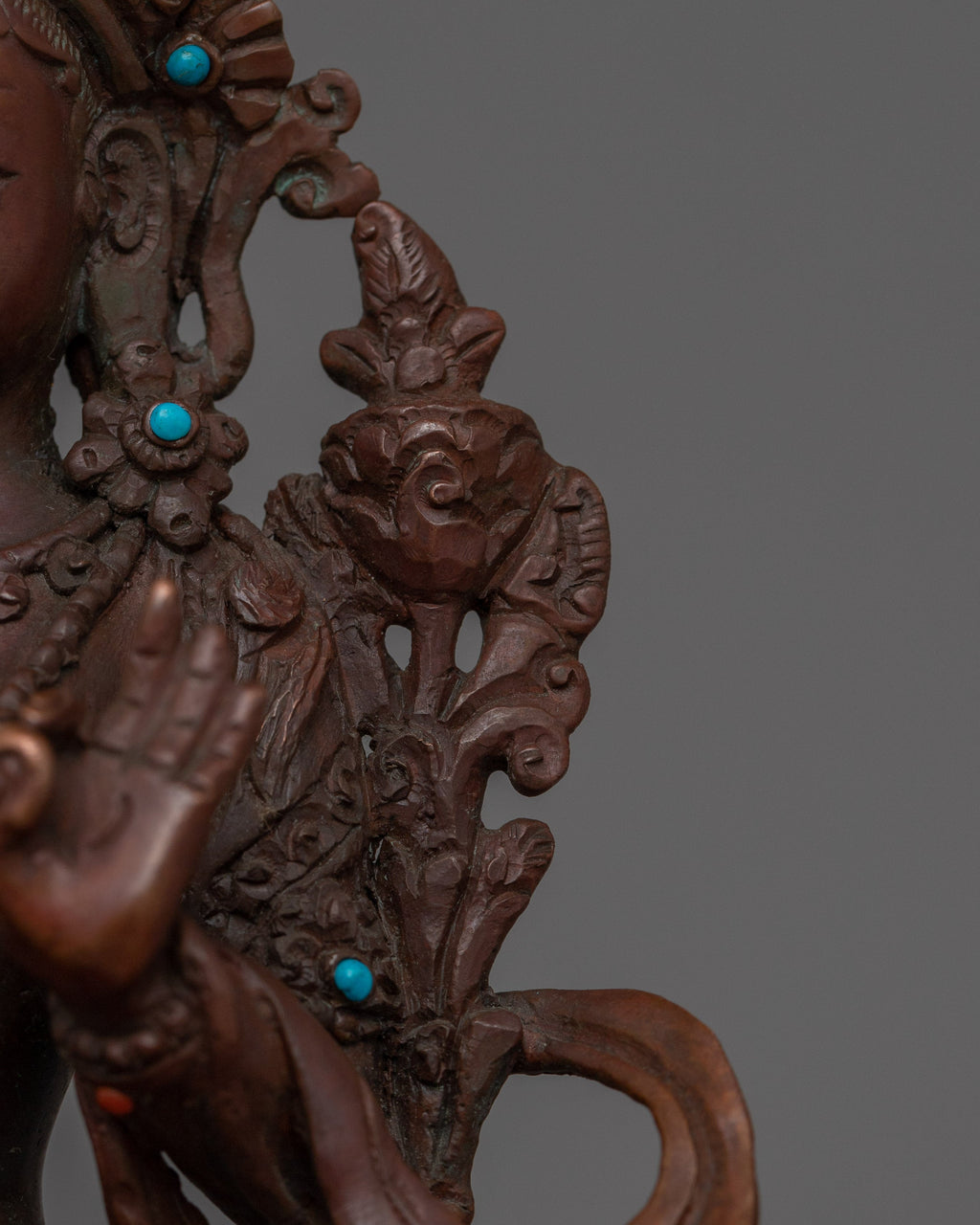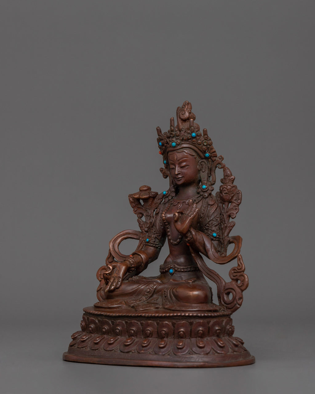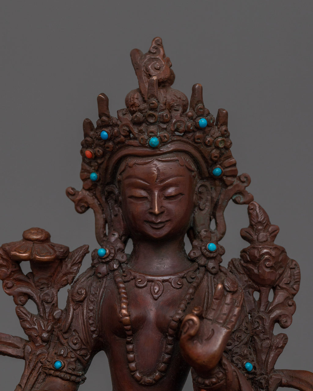 This handmade statue of White Tara, the goddess of healing, measures 6.5”/16.5cm (Height) x 5.1”/13cm (Base) and is made of an oxidized Copper body and gemstones. Designed by talented Nepalese artisans, this detailed sculpture is ideal for altars, meditation areas, or as a meaningful decor item for individuals seeking awareness in their daily lives.