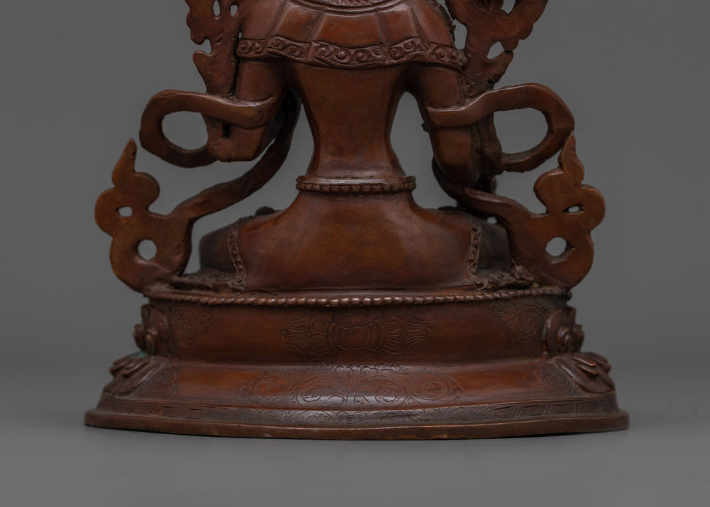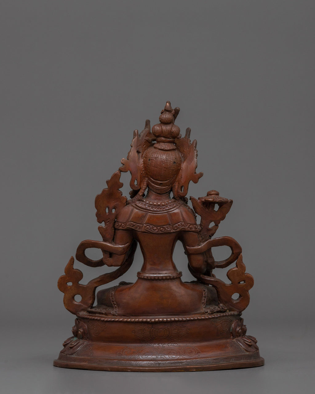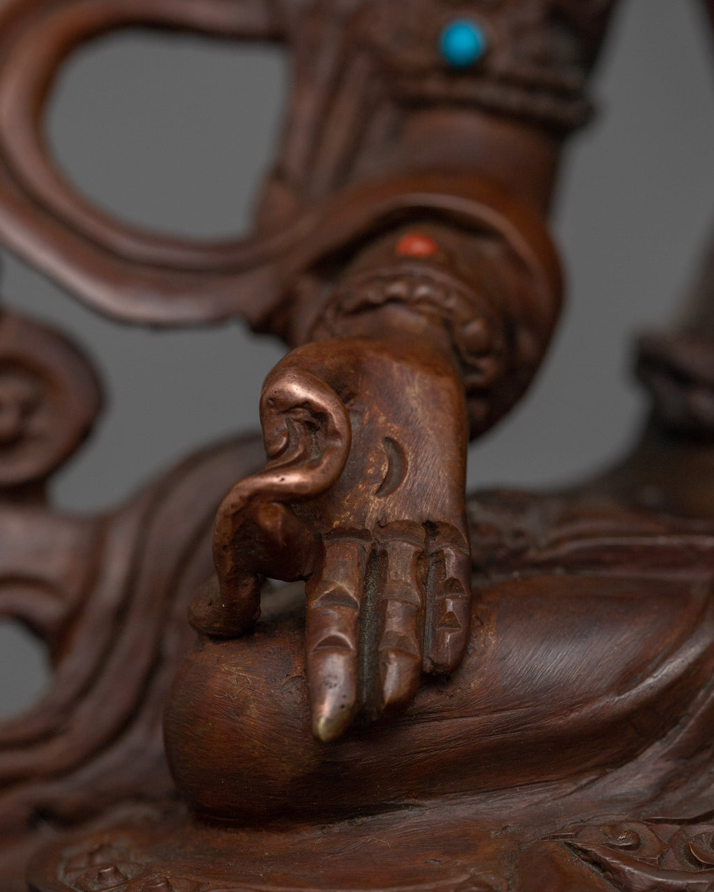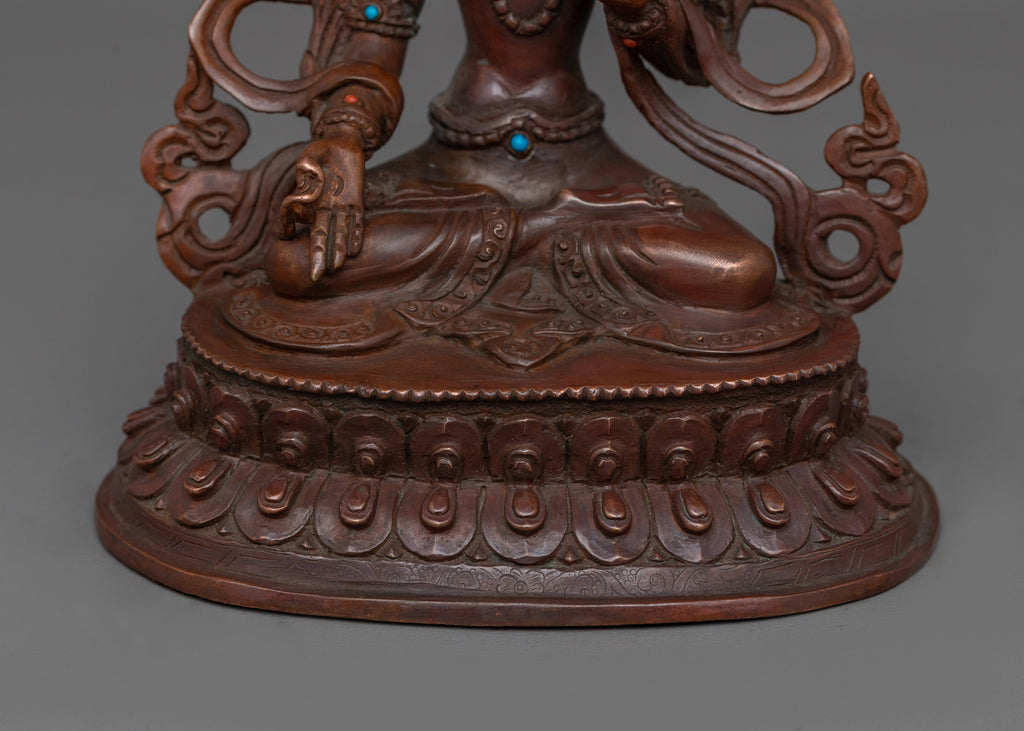 This handmade statue of White Tara, the goddess of healing, measures 6.5”/16.5cm (Height) x 5.1”/13cm (Base) and is made of an oxidized Copper body and gemstones. Designed by talented Nepalese artisans, this detailed sculpture is ideal for altars, meditation areas, or as a meaningful decor item for individuals seeking awareness in their daily lives.
