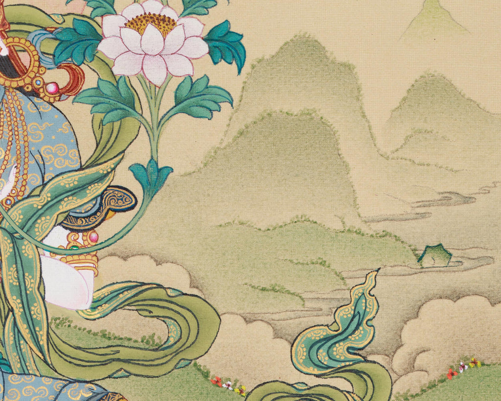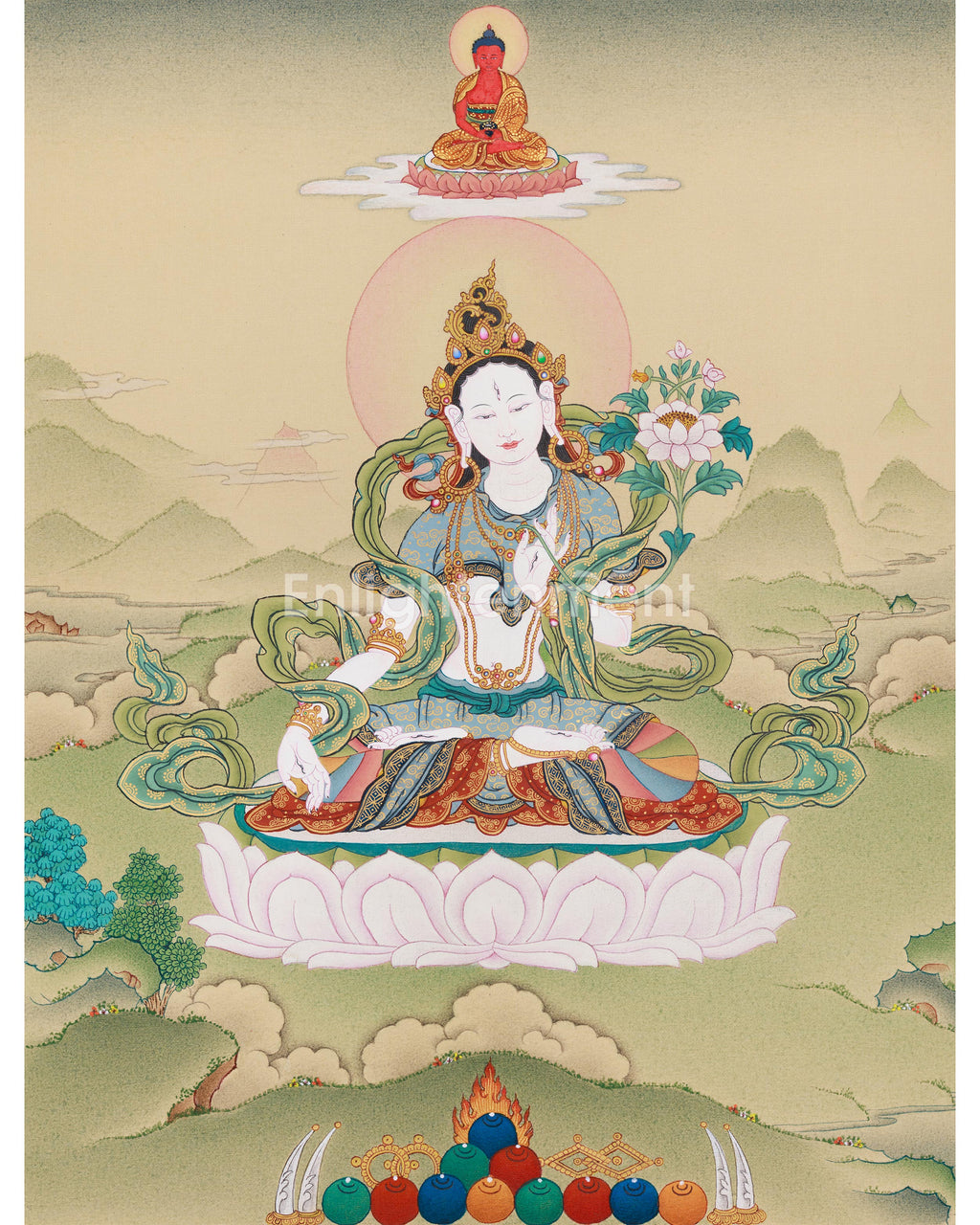 In Tibetan Buddhist tradition, White Tara is revered as the goddess of compassion and longevity, symbolizing protection, healing, and long life. She is depicted with seven eyes, symbolizing her ability to perceive the suffering of all sentient beings and to offer compassionate protection. Amitabha Buddha, known as the Buddha of Infinite Light, is closely associated with White Tara and embodies endless love, compassion, and wisdom. White Tara is gracefully seated on a lotus throne in this thangka, radiating peace and elegance.