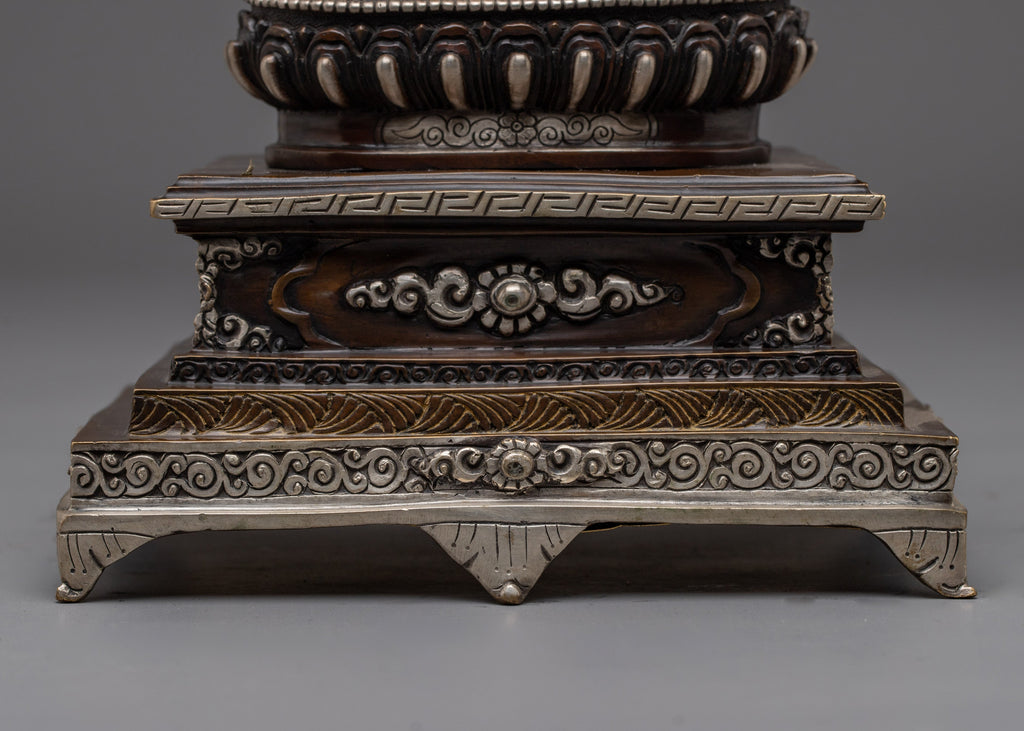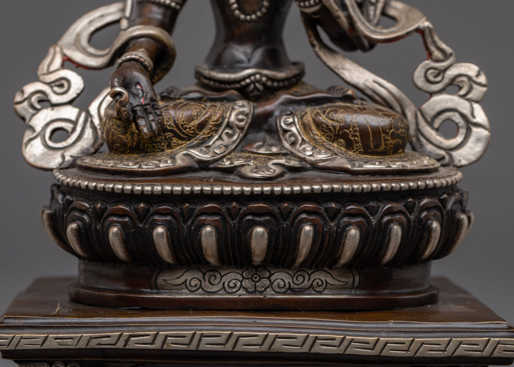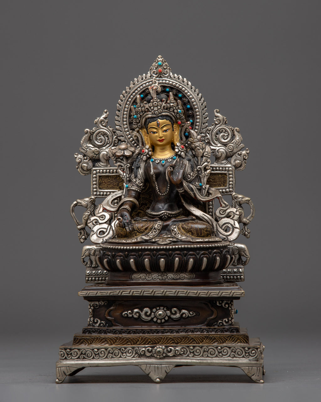 White Tara With Throne Statue stands 10.2” (26 cm) tall with a base width of 6.5” (16.5 cm) and weighs 2.36 kg. It is beautifully handcrafted from an oxidized copper body, silver plated, and adorned with delicate gold and acrylic paintings, as well as gemstone inlays. White Tara, the goddess of compassion, healing, and longevity, is depicted with serene elegance and intricate detailing. This statue is ideal for personal altars, meditation spaces, or as a meaningful spiritual gift representing peace, protection, and long life.