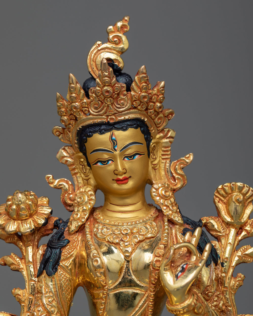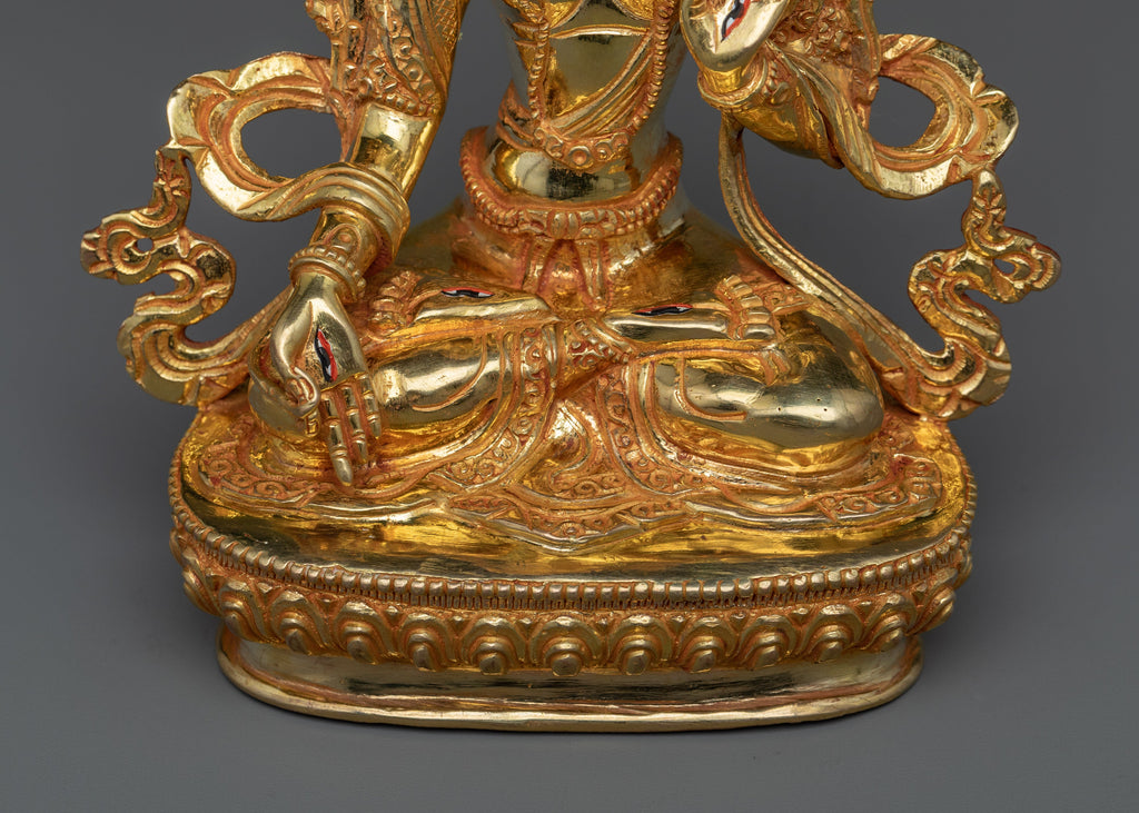 Our handcrafted White Tara statue, a representation of compassion and endurance in Zen Buddhist art, will bring peace into your area. This magnificent piece, which is 8.6" tall with a 6.2" base, is a stunning example of Nepalese artistry. It exudes a serene grace because of its sturdy copper construction, 24K gold plating, and acrylic paints. The craftsmanship of Nepalese craftspeople is evident in every minute detail, from Tara's tranquil look to the exquisitely crafted robes. This statue is the ideal addition to any meditation room, shrine, or any area that might use a little calming Buddhist influence because it invites you to embrace serenity and reflection.