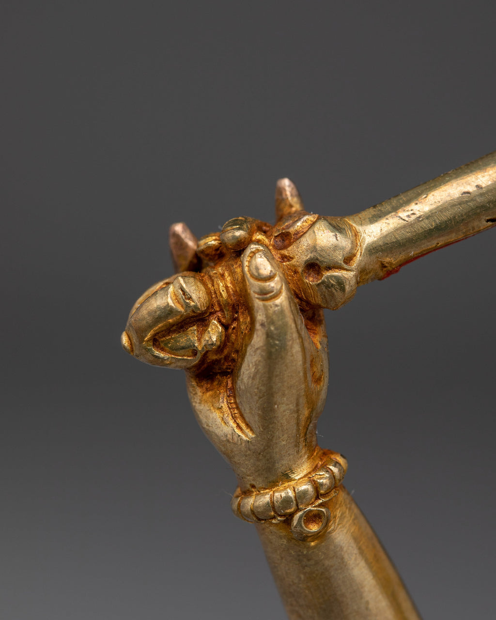 This Supreme Wisdom Bodhisattva Golden Manjushri Statue stands 5.7” (14.5 cm) tall with a 4.1” (10.5 cm) base and weighs 0.48 kg. Skillfully handcrafted from copper and richly gilded in 24K gold, the statue is detailed with gold and acrylic paintings that accentuate its serene presence. Manjushri, the embodiment of transcendent wisdom (prajñā), holds the sword that cuts through ignorance and the lotus supporting the book of wisdom. This exquisite statue makes a profound addition to altars, meditation areas, or spiritual study spaces dedicated to clarity of mind and intellectual awakening.