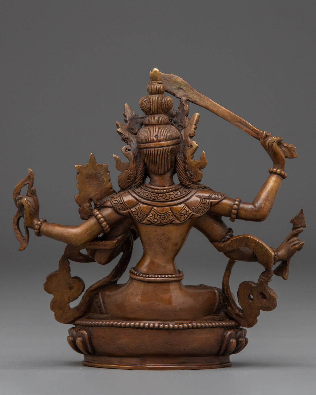 Maha Manjushri sits serenely in the lotus pose, his swirling scarf dancing around him like a gentle breeze. Atop his head rests a five-pointed crown, symbolizing the enlightened minds of the Five Dhyani Buddhas. In his upper right hand, he brandishes the fiery sword of wisdom, ready to slice through ignorance. His lower right hand grips an arrow, sharp and focused, while his upper left holds a bow, together embodying skillful means. The lower left hand offers generosity in varada mudra, from which a lotus stem rises, cradling the sacred Prajñāpāramitā text at his shoulder. This statue beautifully captures Manjushri’s essence as the Bodhisattva of profound insight and transcendent wisdom.