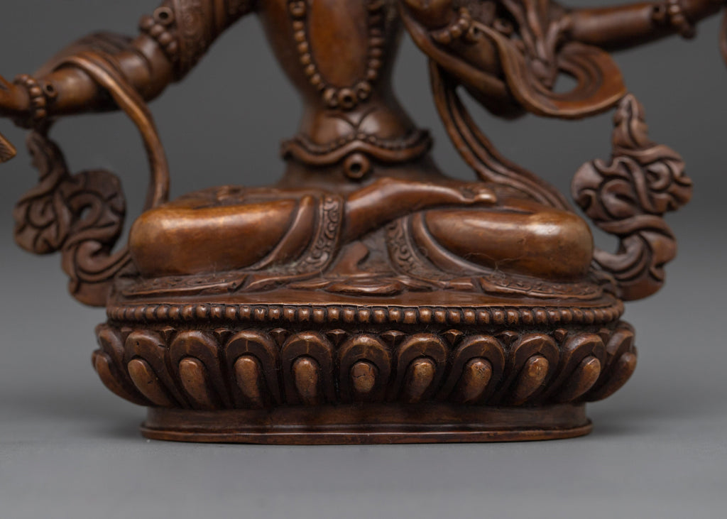 This Wisdom Bodhisattva Maha Manjushri statue stands 5.7” (14.5 cm) tall with a 5.5” (14 cm) broad base and weighs 0.64 kg. Expertly handcrafted from oxidized copper, the statue features a rich patina that enhances its sacred presence and traditional aesthetic. Designed with care by skilled artisans, this statue is a refined representation of Manjushri, the embodiment of transcendent wisdom. Perfect for study areas, meditation spaces, or spiritual collections, it serves as a source of inspiration and clarity.