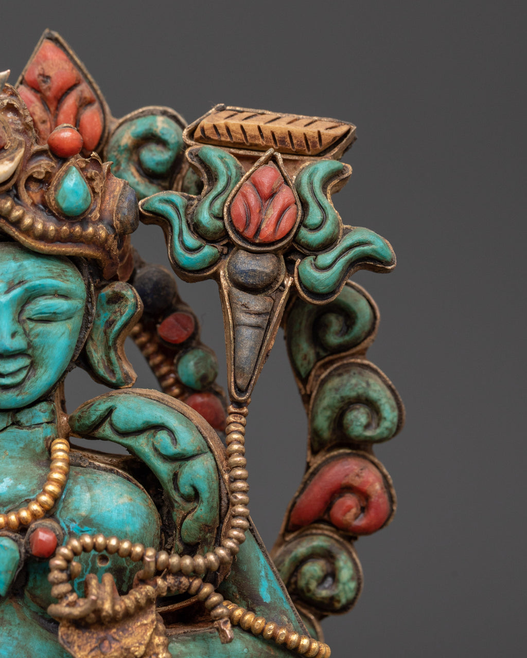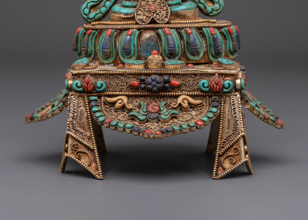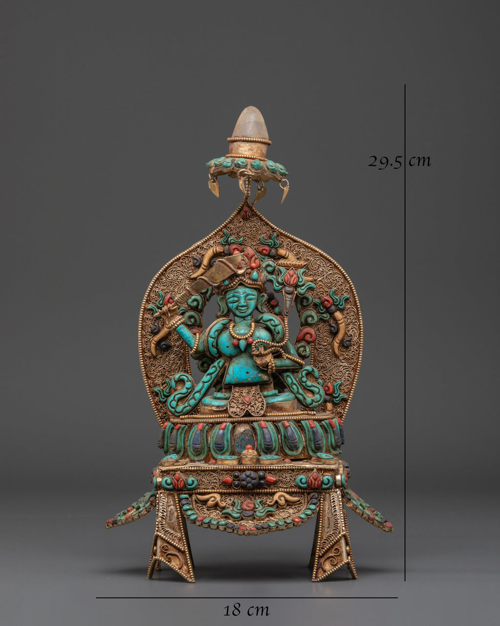 Made from copper, this Manjushri statue showcases expert craftsmanship and design. The detailed features of the statue capture Manjushri’s serene expression and posture, symbolizing the enlightenment of the mind and the triumph over ignorance. The addition of coral and turquoise adds both beauty and spiritual power to the piece. Turquoise is known for its healing properties and protective energy, while coral supports emotional healing and grounding. Together, these elements make this statue a powerful tool for those on a journey of spiritual growth and enlightenment.