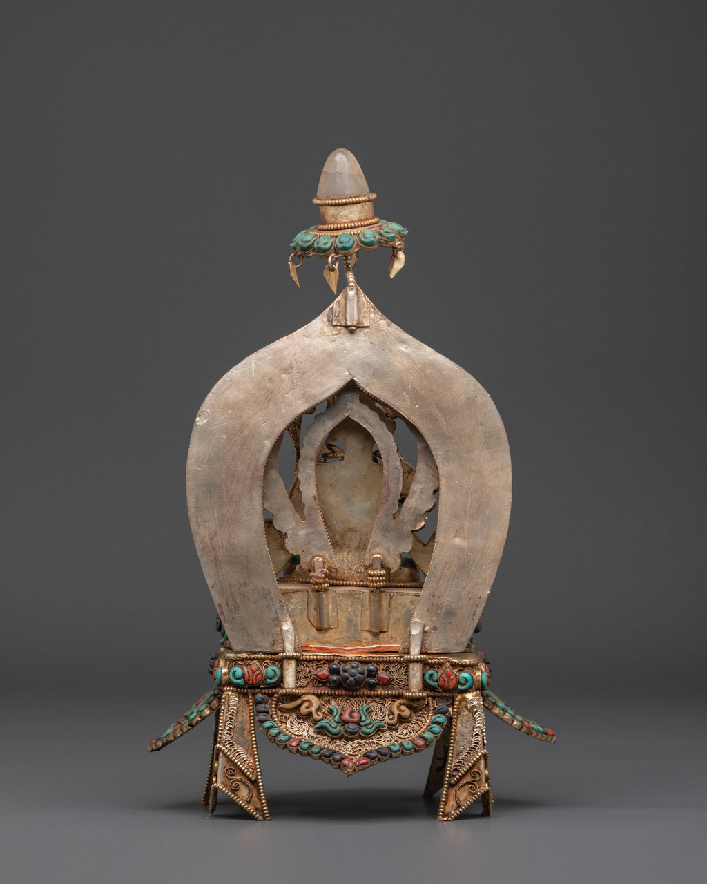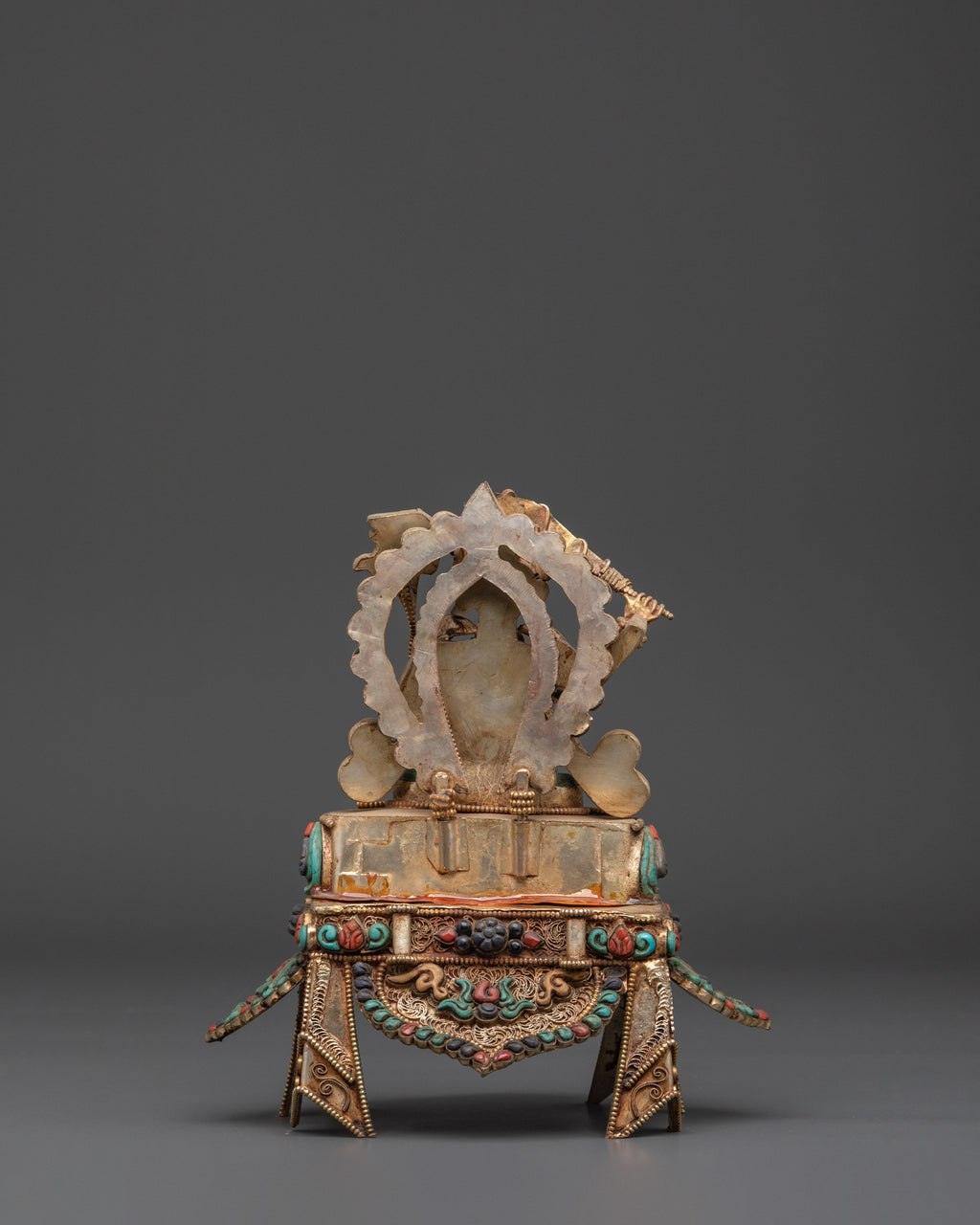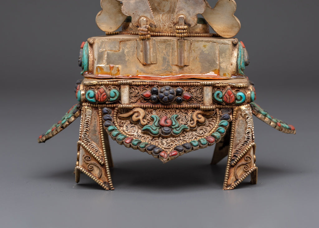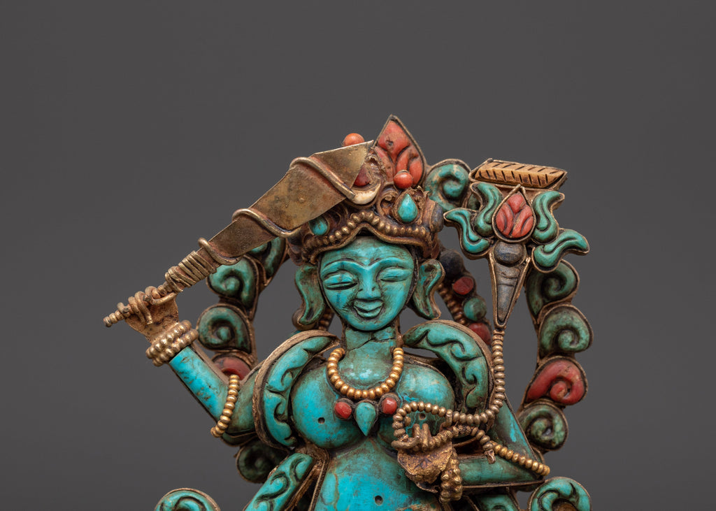 Made from copper, this Manjushri statue showcases expert craftsmanship and design. The detailed features of the statue capture Manjushri’s serene expression and posture, symbolizing the enlightenment of the mind and the triumph over ignorance. The addition of coral and turquoise adds both beauty and spiritual power to the piece. Turquoise is known for its healing properties and protective energy, while coral supports emotional healing and grounding. Together, these elements make this statue a powerful tool for those on a journey of spiritual growth and enlightenment.