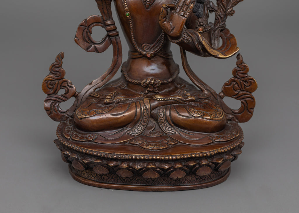 Manjushri is shown holding the flaming sword of wisdom in his right hand, symbolizing the abolition of ignorance, and the Prajnaparamita Sutra in his left hand, representing the embodiment of supreme knowledge. This statue depicts the attributes of clarity, insight, and intellectual force, making it a meaningful object of devotion and an excellent addition to any location dedicated to wisdom and enlightenment.
