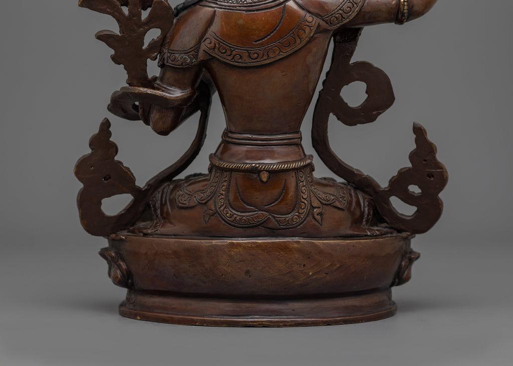 The Tibetan Bodhisattva Manjushri Wisdom Deity measures 10.2 inches (26cm) in height and 7.3 inches (18.5cm) at the base. The Bodhisattva of Wisdom is crafted from an oxidized copper body. The fine details are accentuated with intricate gold and acrylic paintings, while gemstones are thoughtfully placed to add depth and vibrancy. Crafted by expert artisans, this item symbolizes the rich traditions of Himalayan Buddhism, making it an important addition to altars, meditation places, or holy collections.