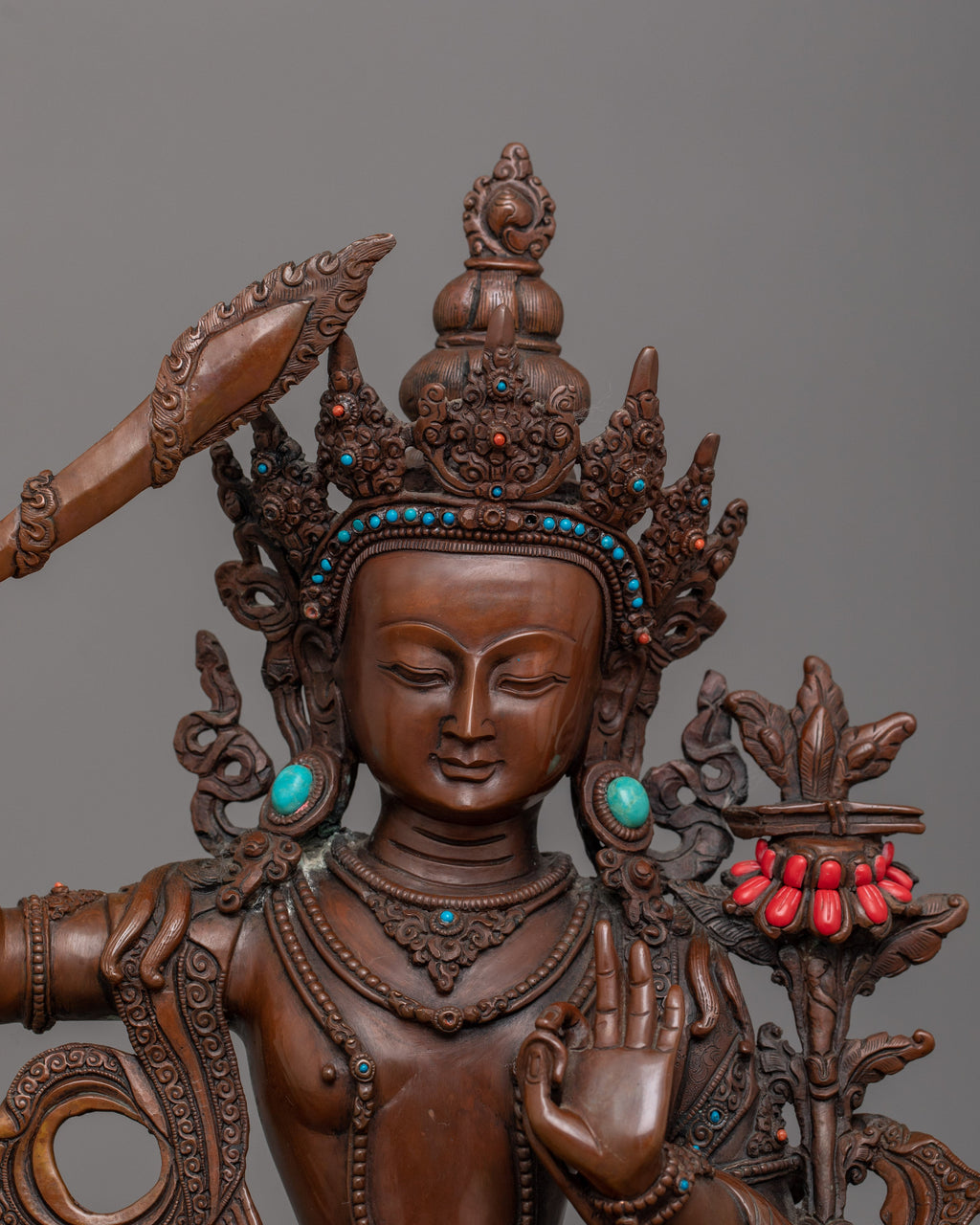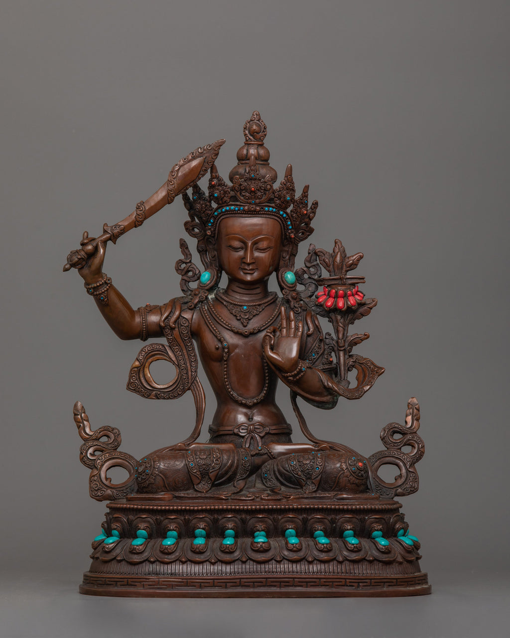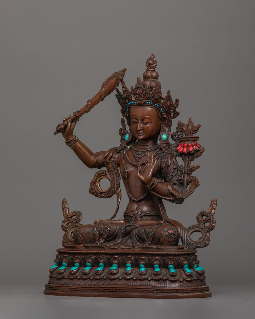 The Wisdom Deity Manjughosa Statue, standing 13.4 inches (34 cm) tall with a base width of 9.8 inches (25 cm), is a representation of the Bodhisattva of Wisdom. Crafted from an oxidized copper body, it features a durable and divine finish that highlights its intricate design. Handcarved gemstones embellish the statue, adding vibrant details and enhancing its spiritual and artistic value.