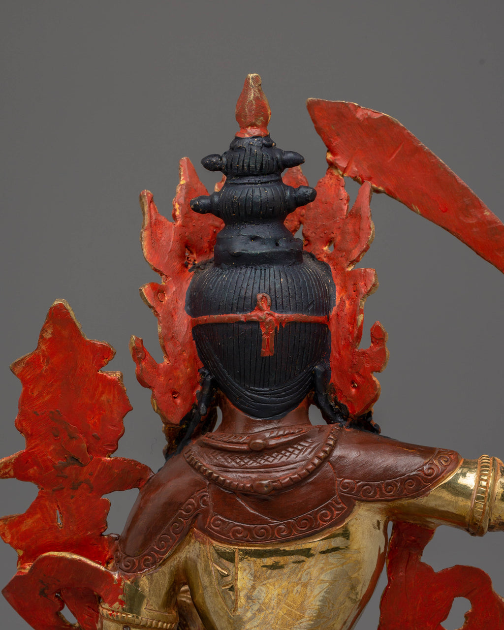 This Supreme Wisdom Bodhisattva Manjushri Statue stands 33.5 cm tall with a 24 cm base and weighs 3.1 kg. Skillfully handcrafted from copper and richly gilded in 24K gold, the statue is detailed with acrylic colors that accentuate its serene presence. Manjushri, the embodiment of transcendent wisdom (prajñā), holds the sword that cuts through ignorance and the lotus supporting the book of wisdom. This exquisite statue makes a profound addition to altars, meditation areas, or spiritual study spaces dedicated to clarity of mind and intellectual awakening.