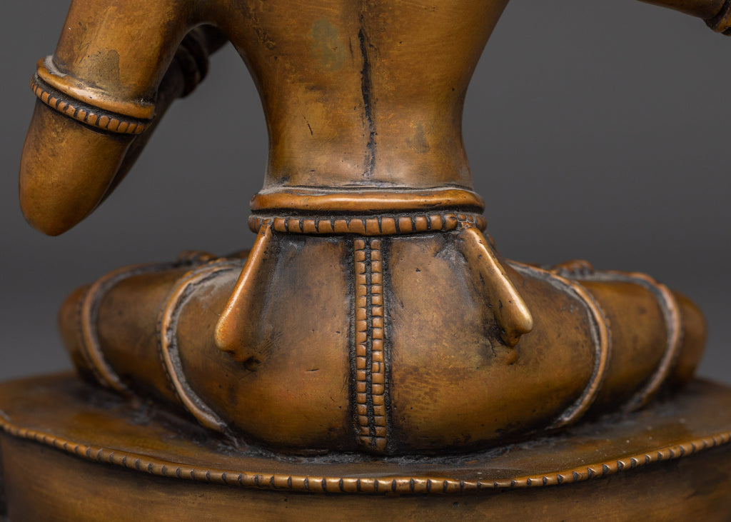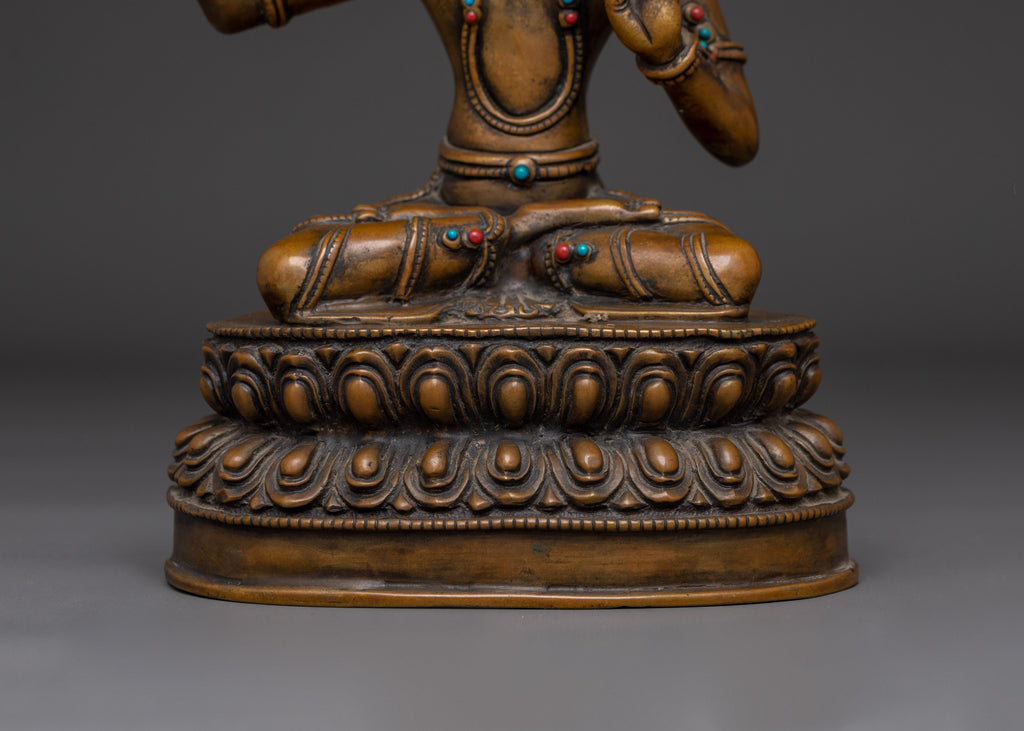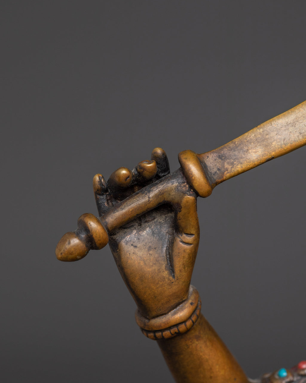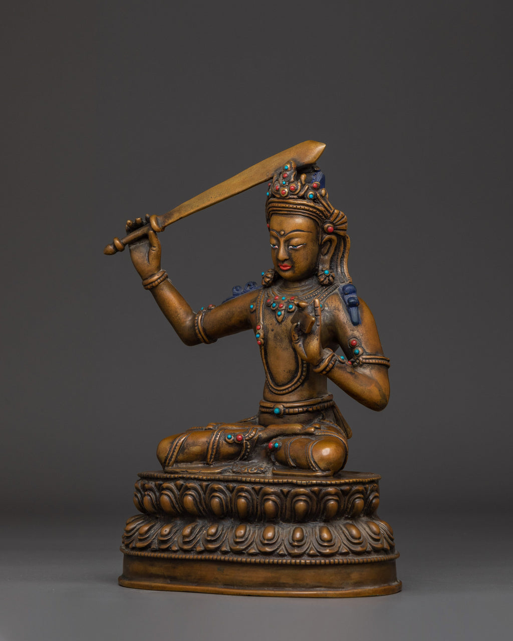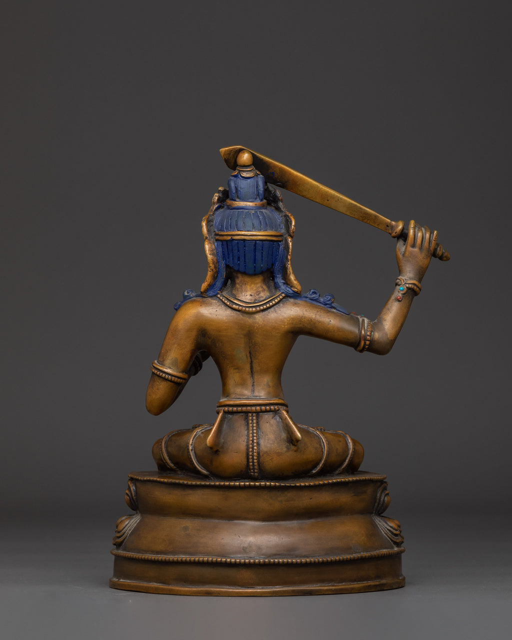 This Supreme Wisdom Embodiment Manjushri statue measures 10.4”/26.5cm in height and 7.1”/18cm at the base and weighs 2.69 kg. Made from oxidized copper and adorned with gemstones, it highlights a refined aesthetic with a sense of timeless presence. Handcrafted by skilled Nepali artisans, it is a powerful representation of transcendent wisdom and makes an ideal addition to personal altars, study spaces, or spiritual collections.