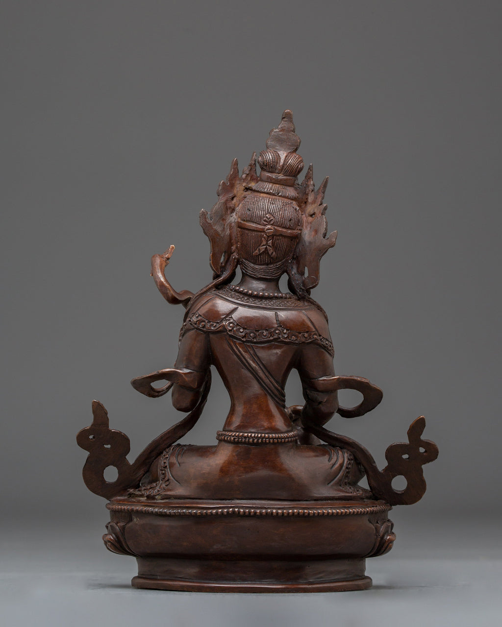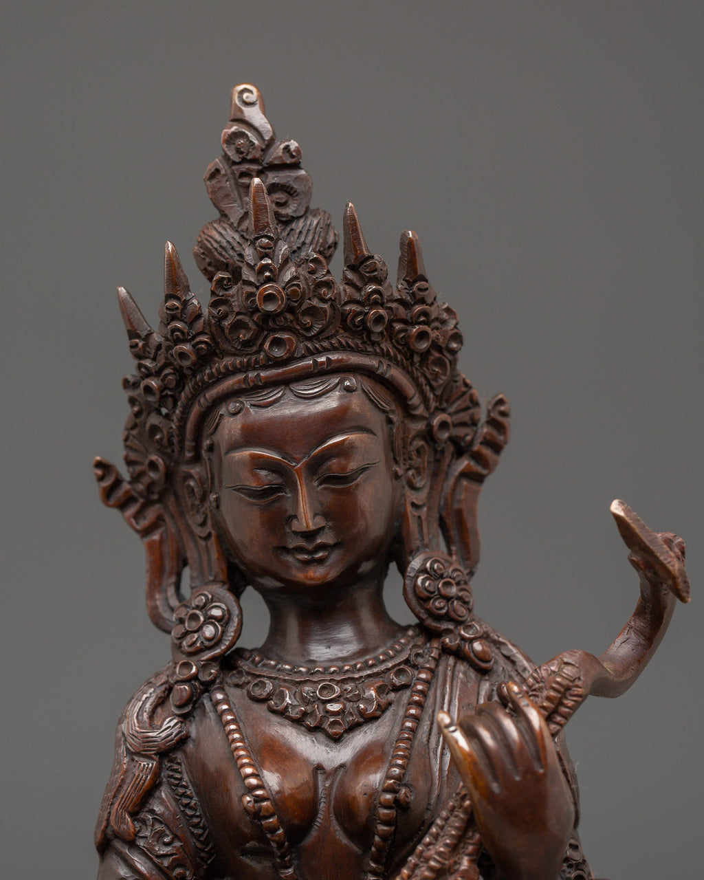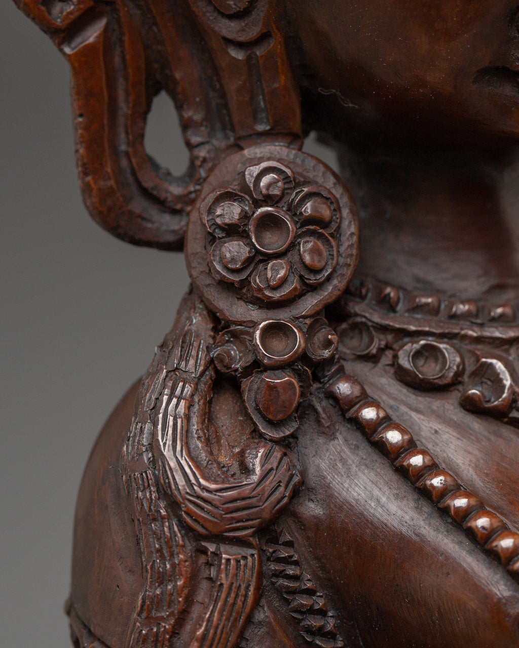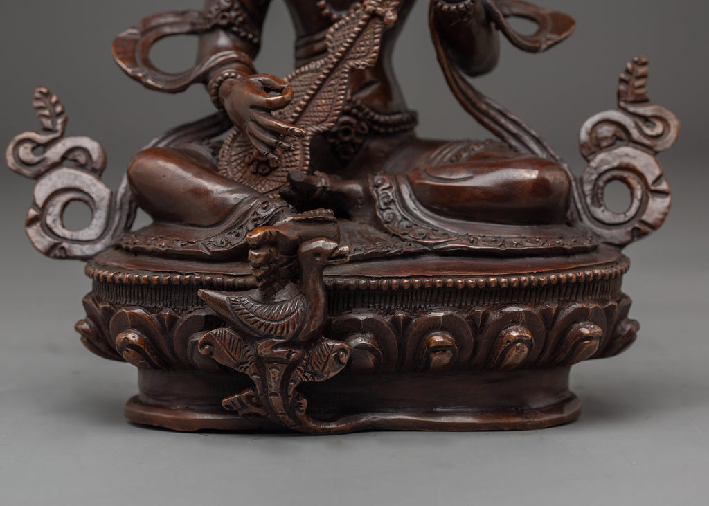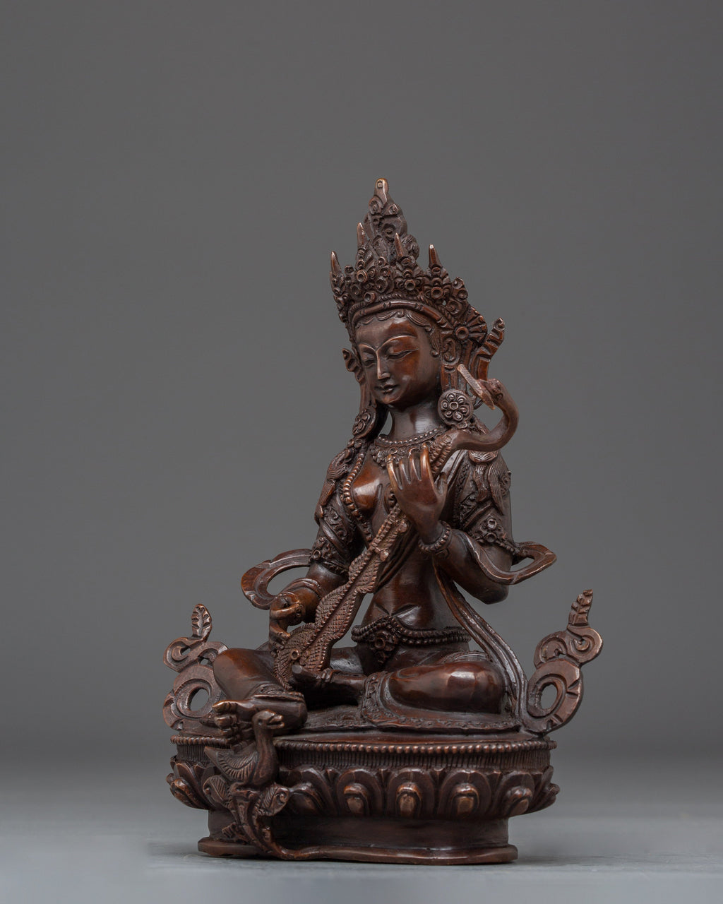 This Wisdom Goddess Saraswati Spiritual Statue stands at 9.3” (23.5 cm) in height and 6.7” (17 cm) at the base, with a weight of 1.65 kg. Handcrafted from oxidized copper. This sculpture, handcrafted by expert Nepalese artisans, elegantly symbolizes Himalayan Buddhism's sacred traditions, making it an appropriate addition to altars, meditation places, or sacred collections.