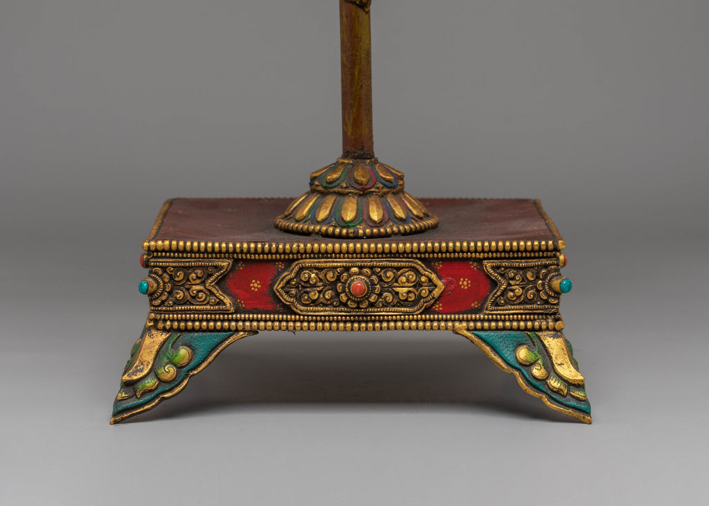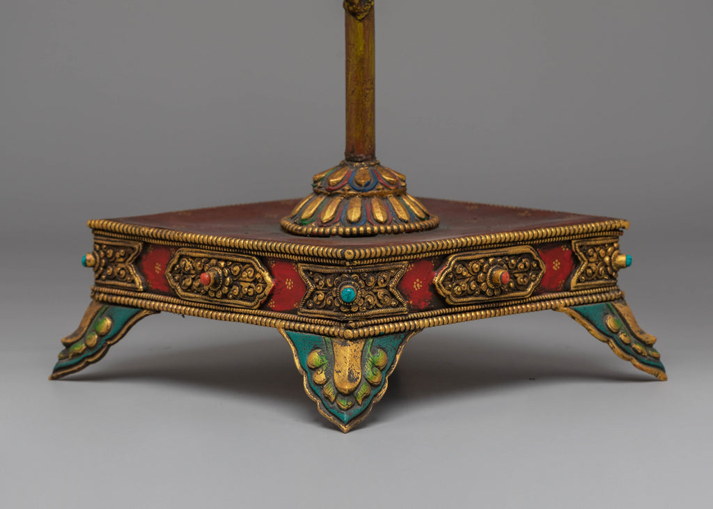 This magnificent Wish-Fulfilling Seven Jewel Tree is a masterfully crafted copper sculpture, elegantly electro-gold-plated to highlight its intricate beauty. Standing 57 cm tall and 36 cm wide, it serves as a stunning centerpiece for any meditation space or sacred altar. The tree's design incorporates various auspicious symbols, each carrying significant spiritual meaning in Tibetan Buddhism. These symbols are meticulously hand-painted with vibrant acrylic colors, adding depth and vibrancy to the piece.