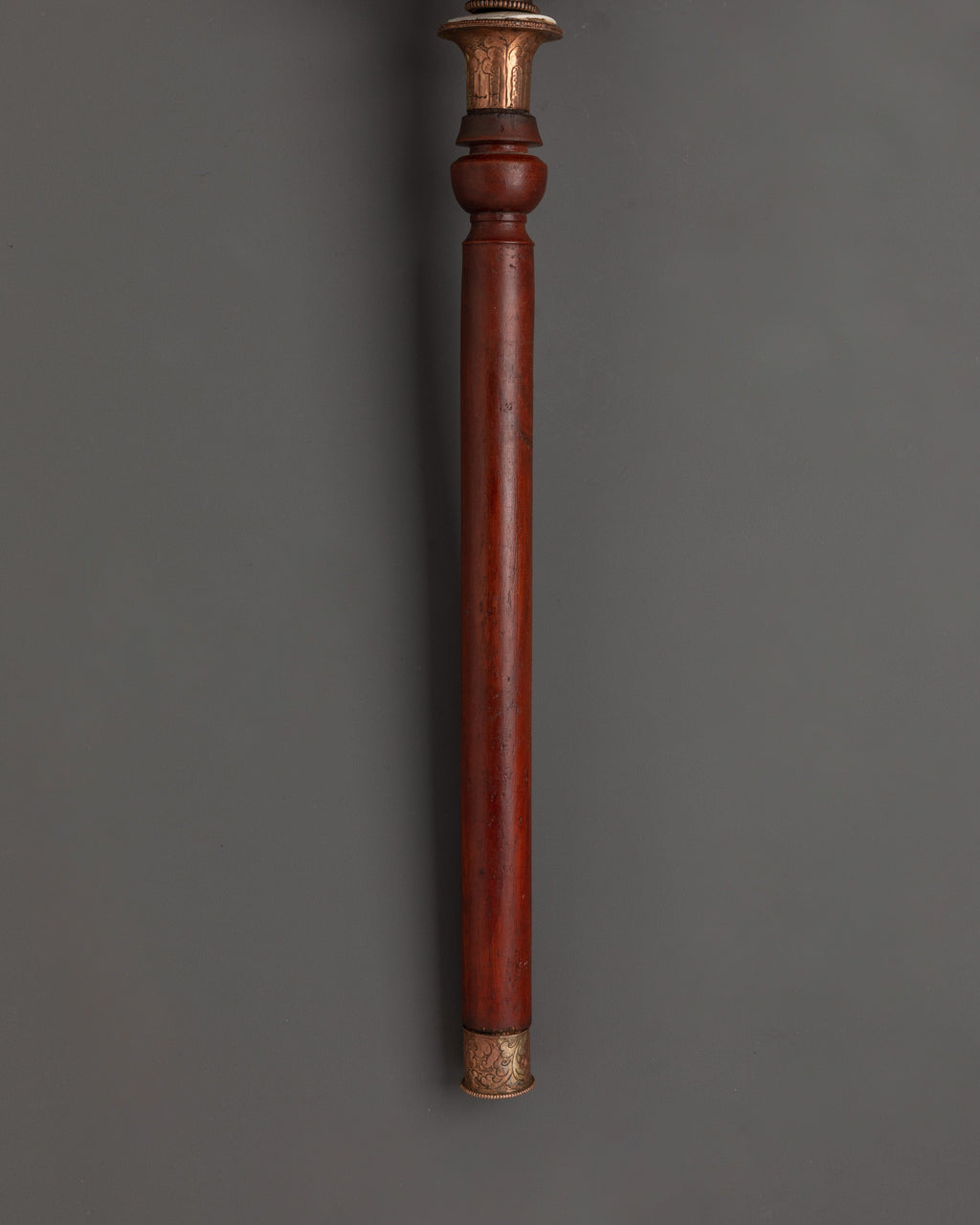 This 38.5cm tall wooden handle Tibetan prayer wheel, measuring 9.5cm in width and weighing 0.47kg, is a stunning example of spiritual craftsmanship. The main body is constructed of oxidized copper and features the holy mantra "Om Mani Padme Hum," while the grip is carved from smooth, polished wood. This prayer wheel is designed to be easy to use, fitting nicely in the hand, making it both practical and meaningful for personal rituals and spiritual practices.