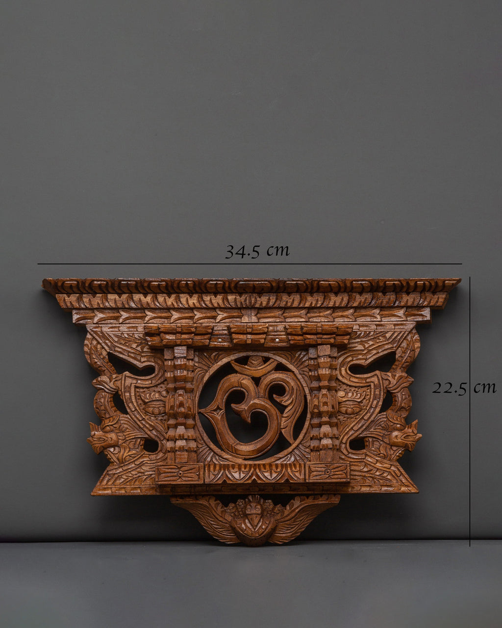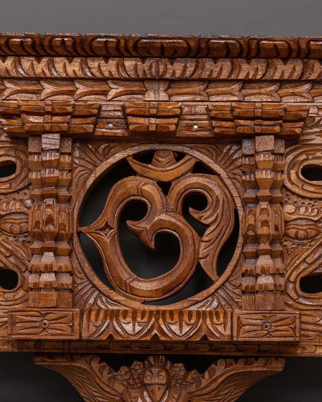 The Om symbol at the center of the piece represents the essence of ultimate reality, consciousness, and the interconnectedness of all things. It is often used in meditation practices to help bring the mind to a state of calm and focus. The hand-carved wood complements this spiritual symbolism, giving the piece a grounding, earthy feel. The detailed craftsmanship, including geometric motifs and circular elements, enhances the wall decor's overall spiritual meaning and aesthetic appeal, making it a timeless addition to any room.