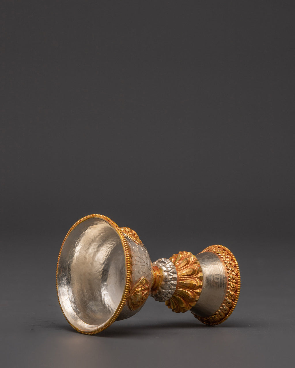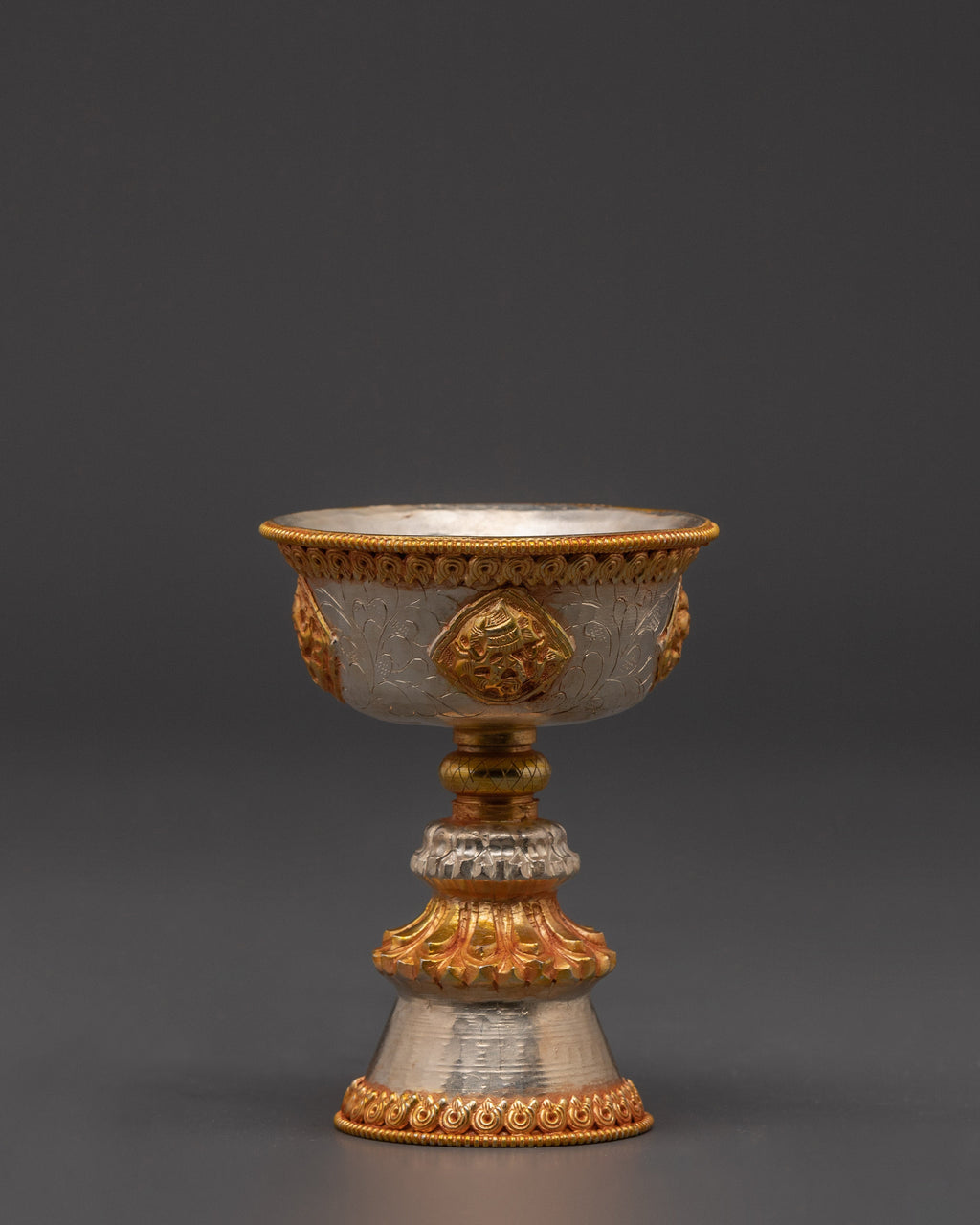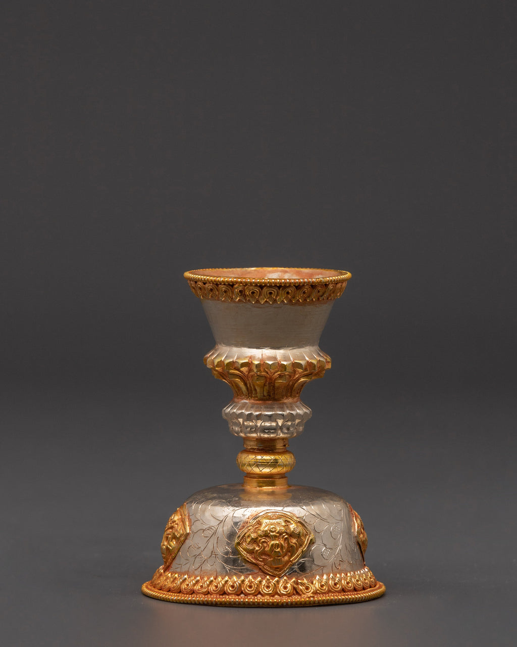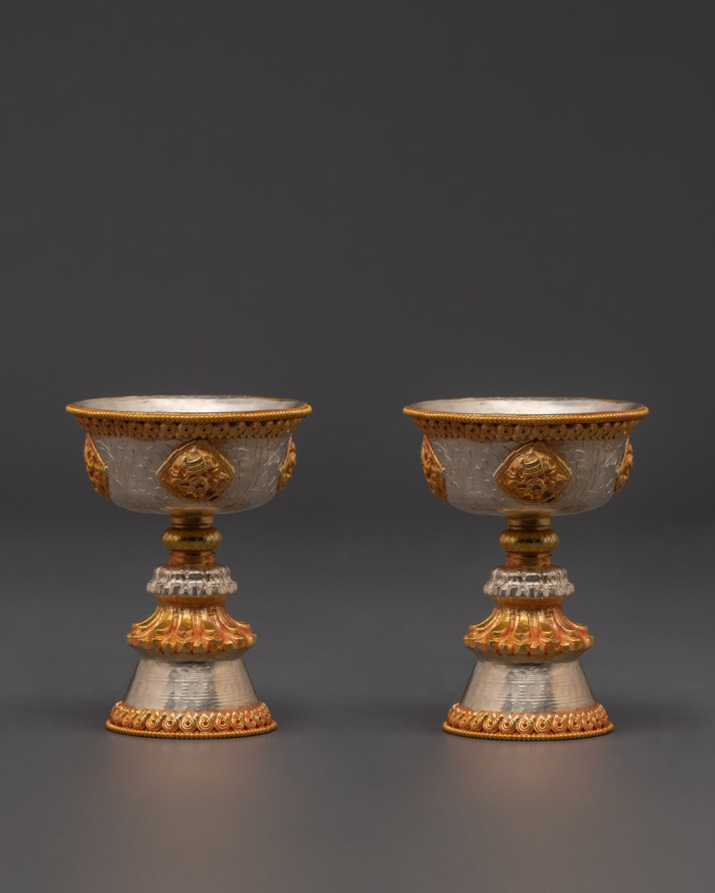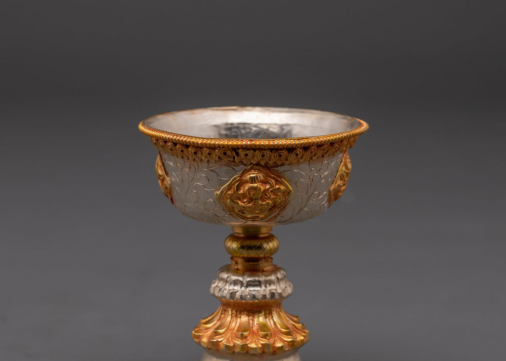 Our Worship Butter Lamp Set represents enlightenment and spiritual dedication and is a lovely focus point for your meditation space. The gold and silver plating offers a refined luster while representing the balance of light and purity in spiritual traditions. This copper light set, perfect for Buddhist ceremonies, prayer sessions, or as a decorative element, adds a classic touch to your altar. Enhance your practice with the beauty and peace that these ritual butter lights bring.