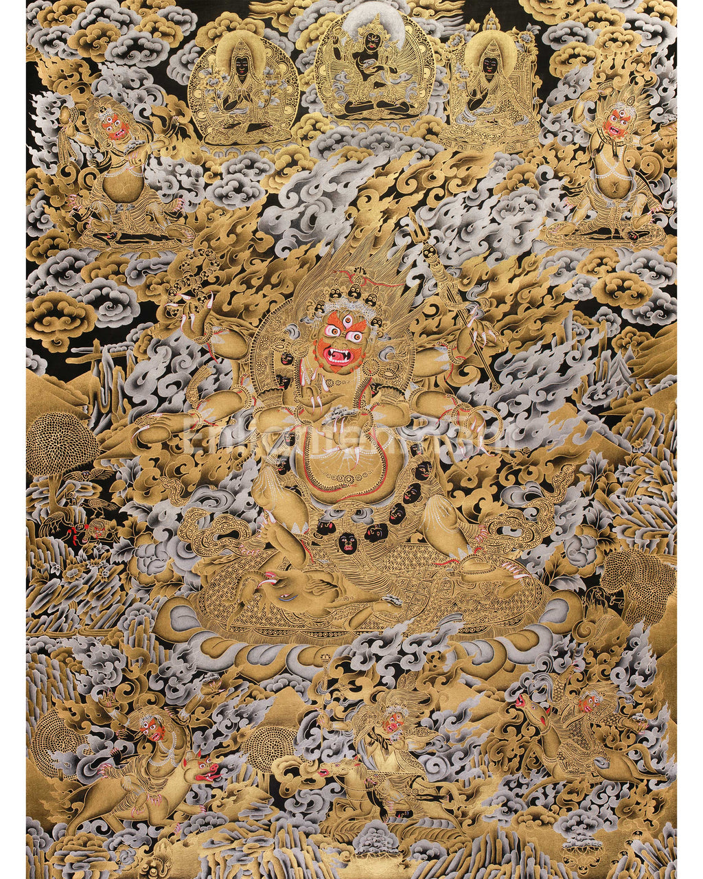 In the backdrop, additional Dharmapalas can be seen, reinforcing the protective energy of Mahakala. Their presence emphasizes the harmonious coordination of spiritual warriors in the fight to preserve the sacred teachings. Above Mahakala, enlightened Buddhist masters are depicted, symbolizing the transmission of wisdom and the continuous effort to overcome the cycle of samsara.