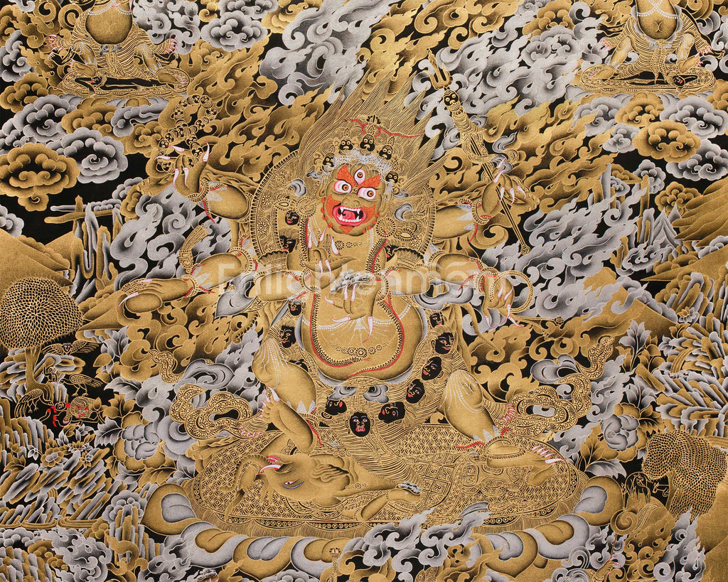 An extraordinary Thangka artfully captures the intense wrath of Mahakala, one of the most revered and fearsome Dharmapalas. Known for his fierce appearance, Mahakala is depicted here with six arms, each wielding a distinct weapon that symbolizes his comprehensive powers to safeguard the Dharma. The trident, sword, noose, skull cup, damaru, and rosary of skulls represent various aspects of his protective nature: the trident for his ability to sever attachments, the sword to cut through ignorance, the noose to bind and control negative forces, the skull cup as a vessel of wisdom, the damaru drum to invoke the sound of truth, and the rosary of skulls as a reminder of impermanence and the cycle of life and death.